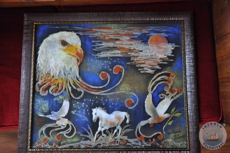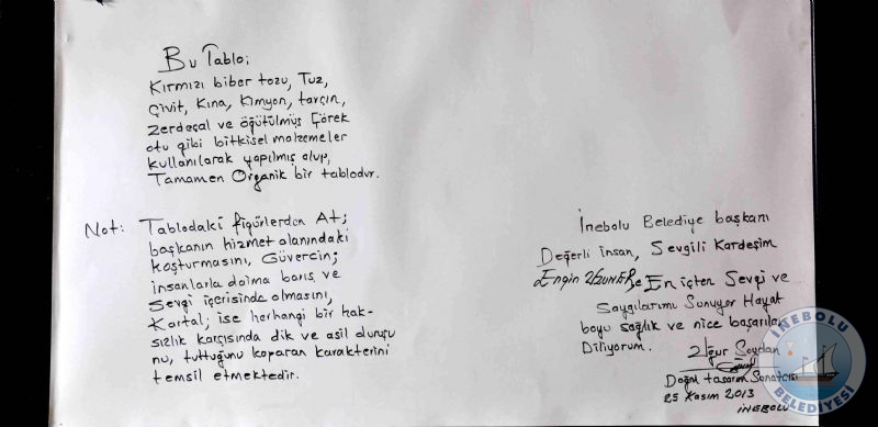 Ziyaretinde Belediye Başkanımız Engin UZUNER’e bitkisel malzemeler kullanarak yaptığı organik tablo hediye etti. Başkanımız UZUNER, organik tablonun konusu ile ilgili açıklamalarda bulundu.
