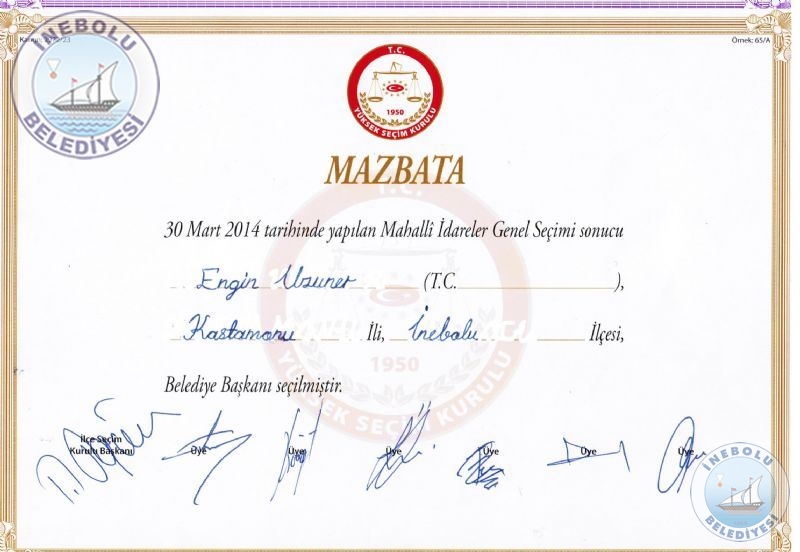 Belediye Başkanımız Engin UZUNER mazbatasını, 07 Nisan 2014 Pazartesi günü bugün saat 16.00’da Ağır Ceza Reisi Atilla OĞUZ’un elinden aldı.