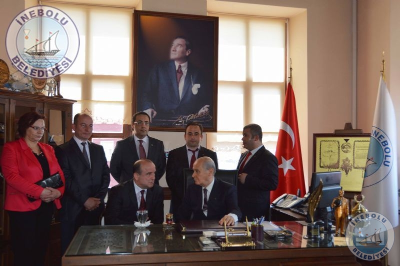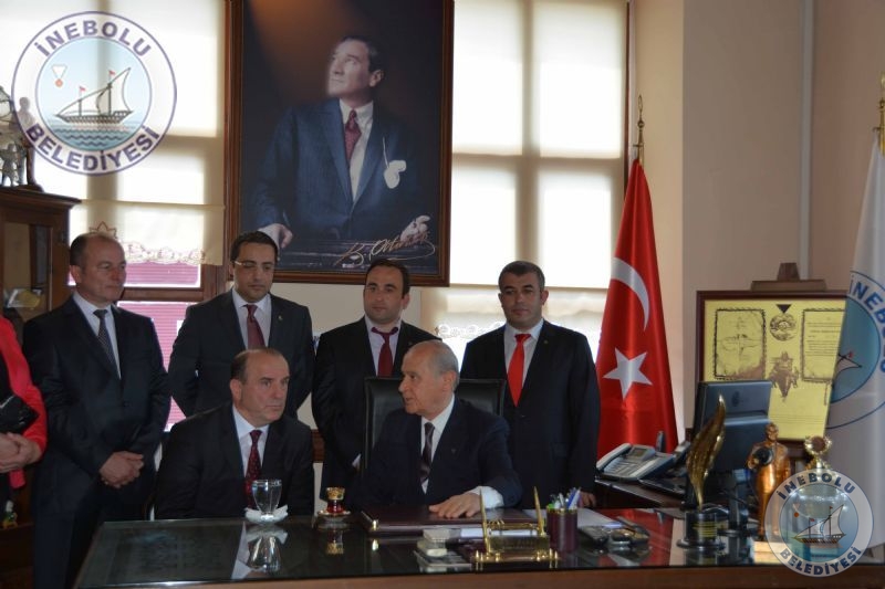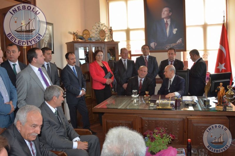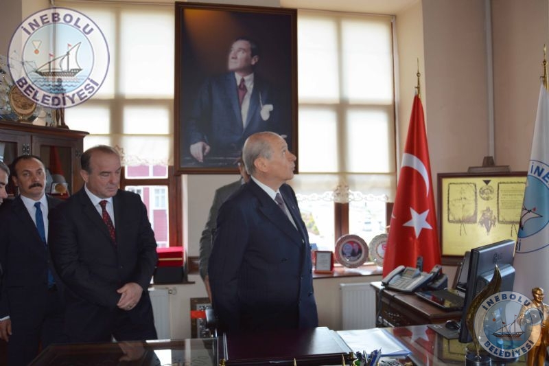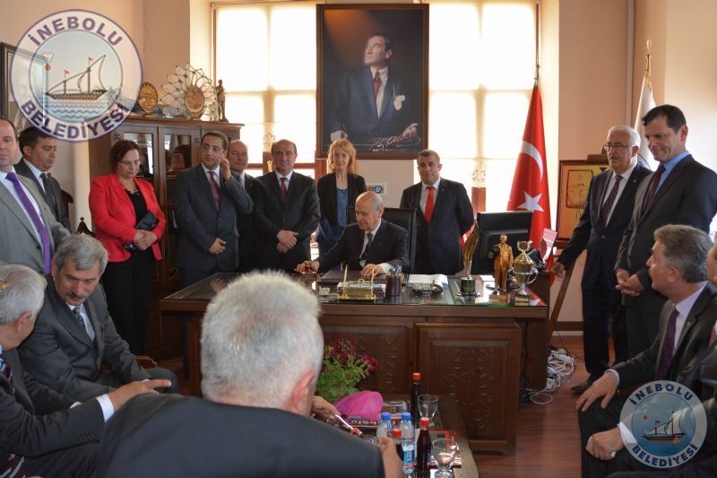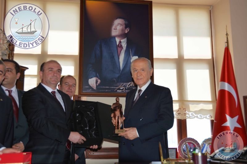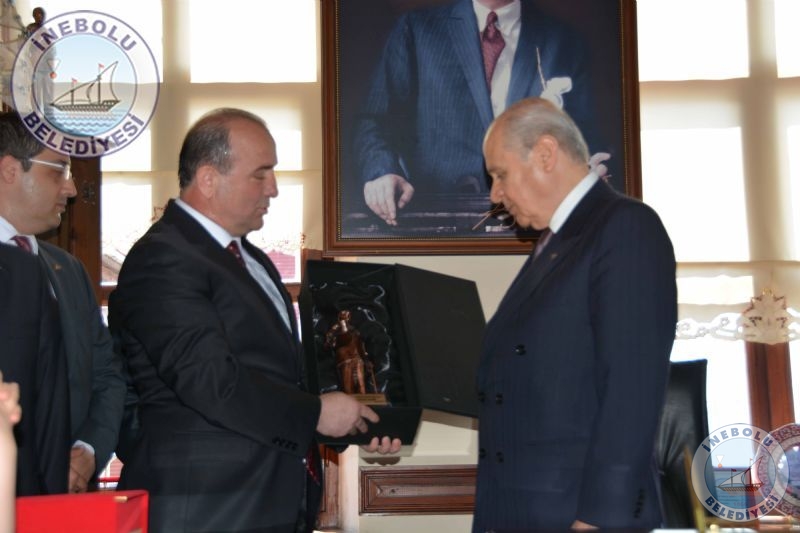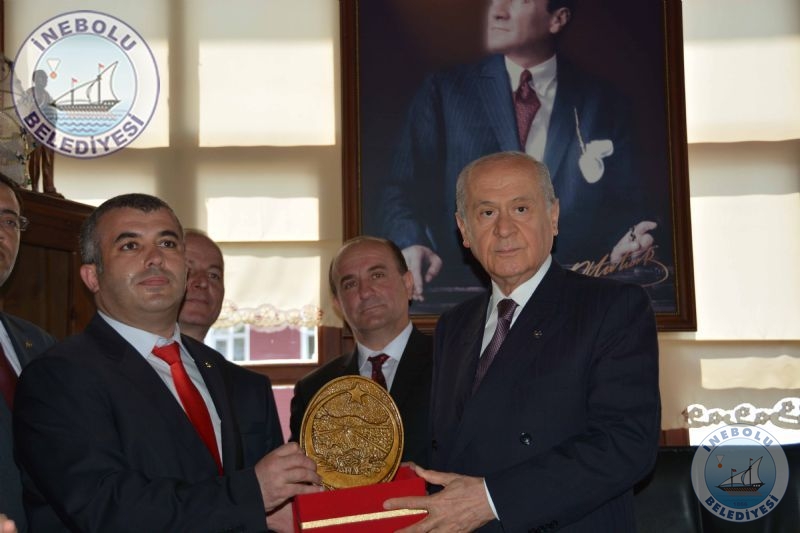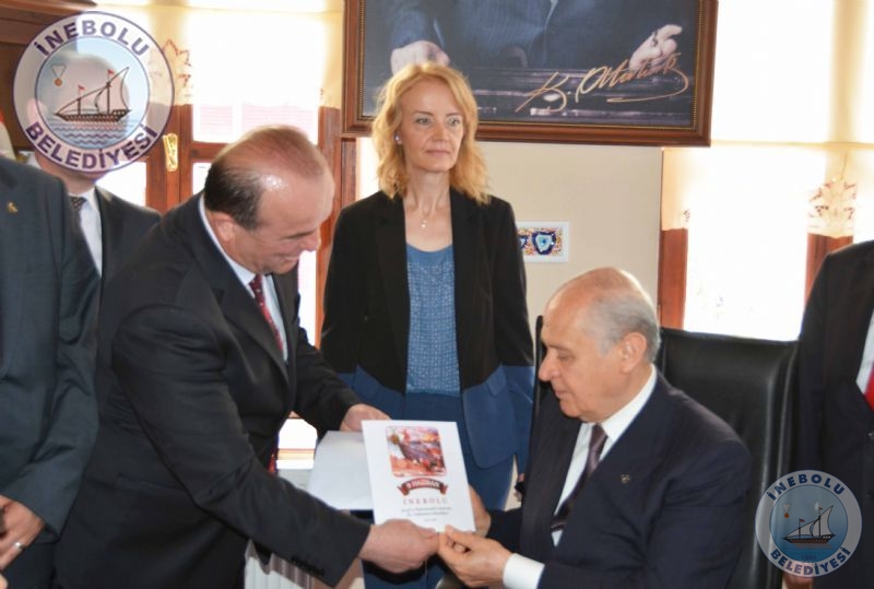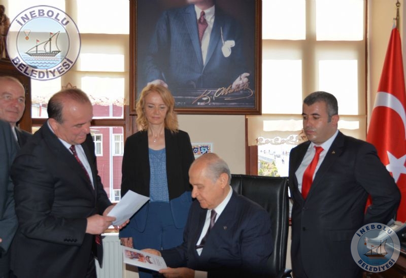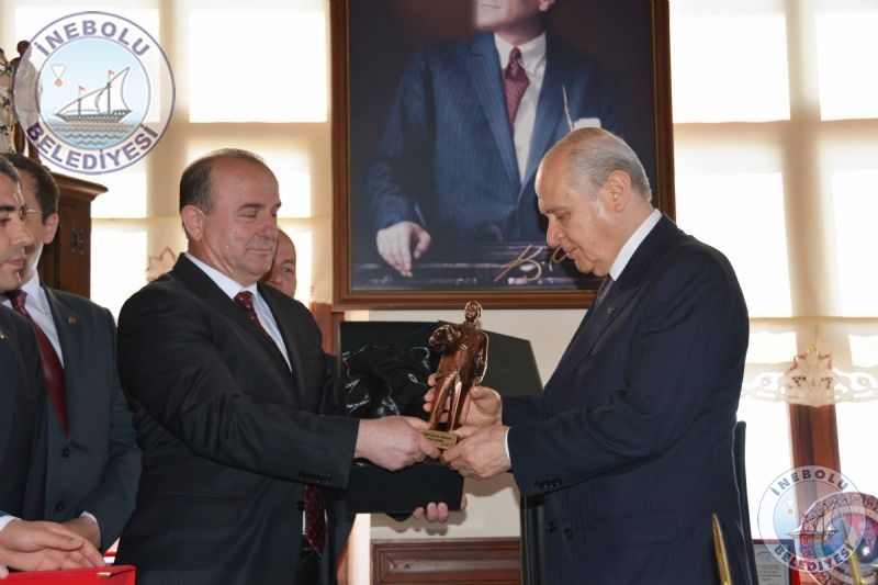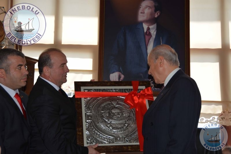 Başkanlık Makamında gerçekleştirilen ziyarette Belediye Başkanımız Engin UZUNER , BAHÇELİ’ye alimünyum folyoda İnebolu logosu işlenmiş tablo ile Şapka elinde Atatürk Rölyefi takdim etti. MHP İlçe Başkanı Mustafa ATEŞ ise BAHÇELİ’ye İstiklal Madalyası takdim edildi. Belediyemizden ayrılmadan önce BAHÇELİ, Belediye Personeli ile hatıra fotoğrafı çektirdi. Ardından Belediye binası önünde vatandaşlara hitap etti. Devlet BAHÇELİ, Belediye önündeki görüşmenin ardından Türk Ocağı binası önünde bulunan İstiklal Madalyası önünde fotoğraf çektirdi. Banka oturarak poz veren Bahçeli ve beraberindekiler yemek için İnebolu Öğretmenevi’ne geçti. Yemeğin ardından İnebolu Spor Kulübü yönetim ve oyuncuları tarafından Devlet BAHÇELİ’ye İnebolu Spor atkısı hediye edildi. Bahçeli yemek sonunda Bozkurt ilçesini ziyaret ederek, Çatalzeytin’e geçti.