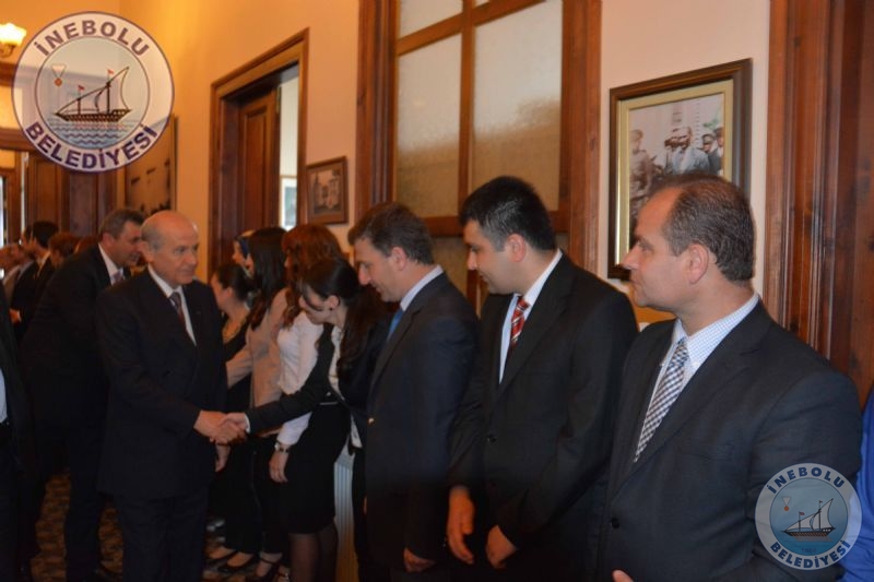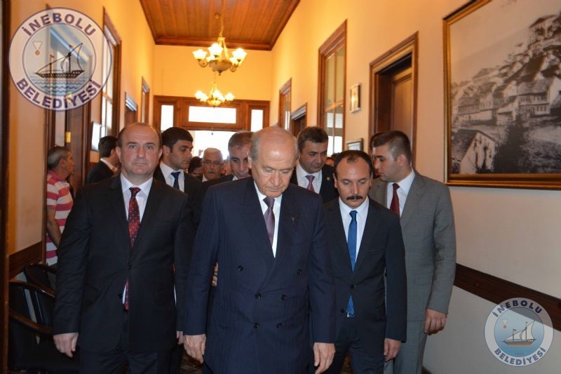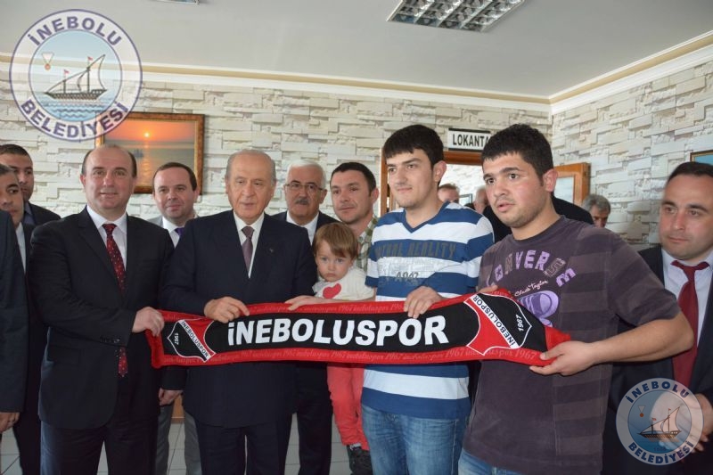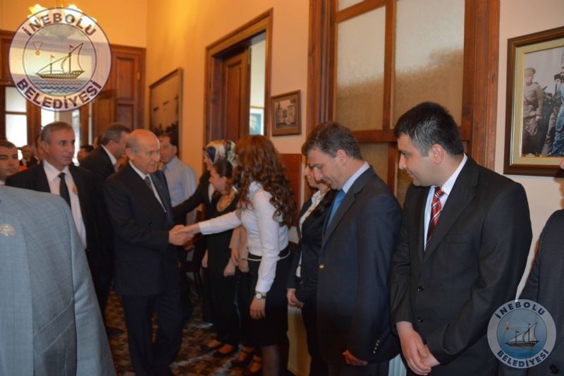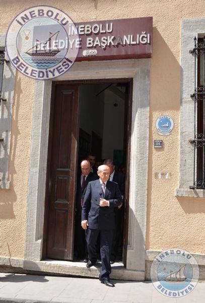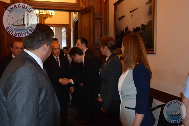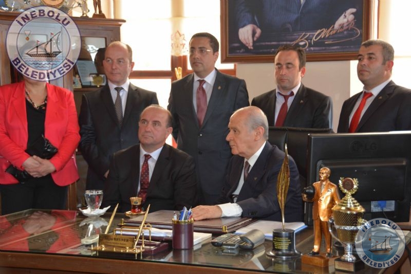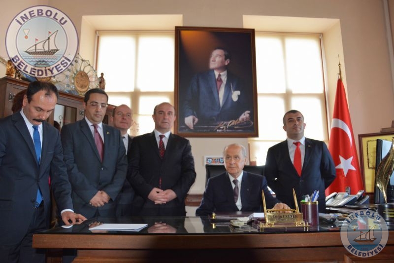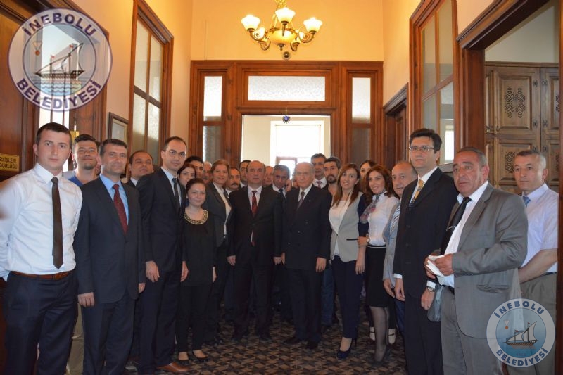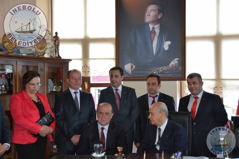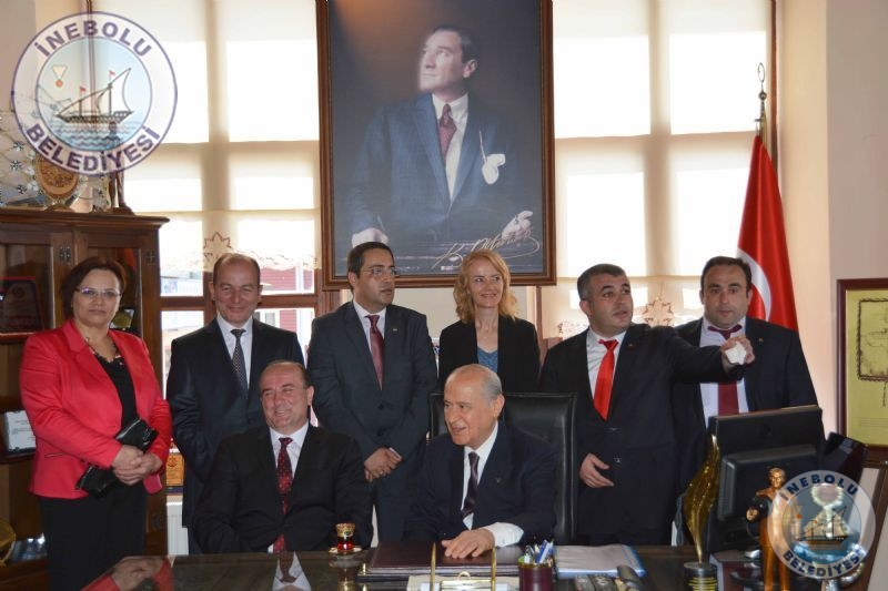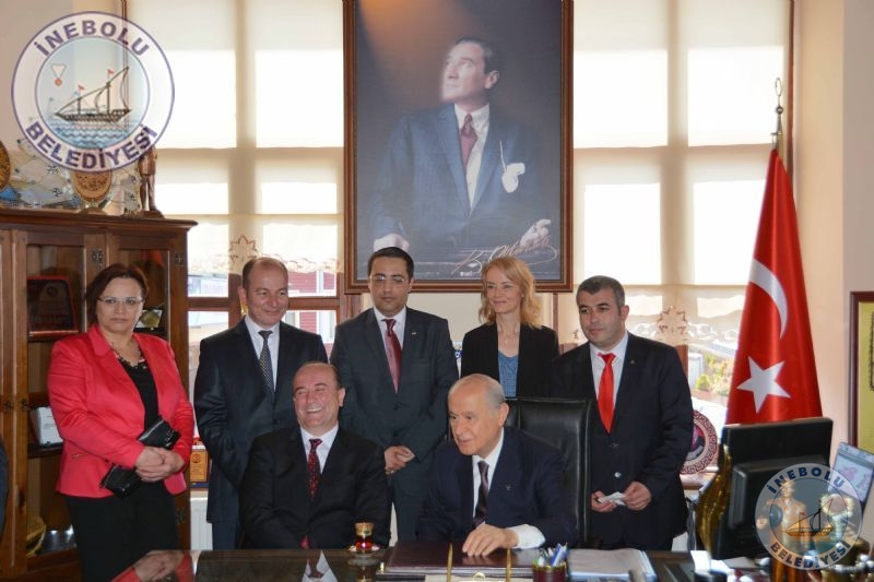 Başkanlık Makamında gerçekleştirilen ziyarette Belediye Başkanımız Engin UZUNER , BAHÇELİ’ye alimünyum folyoda İnebolu logosu işlenmiş tablo ile Şapka elinde Atatürk Rölyefi takdim etti. MHP İlçe Başkanı Mustafa ATEŞ ise BAHÇELİ’ye İstiklal Madalyası takdim edildi. Belediyemizden ayrılmadan önce BAHÇELİ, Belediye Personeli ile hatıra fotoğrafı çektirdi. Ardından Belediye binası önünde vatandaşlara hitap etti. Devlet BAHÇELİ, Belediye önündeki görüşmenin ardından Türk Ocağı binası önünde bulunan İstiklal Madalyası önünde fotoğraf çektirdi. Banka oturarak poz veren Bahçeli ve beraberindekiler yemek için İnebolu Öğretmenevi’ne geçti. Yemeğin ardından İnebolu Spor Kulübü yönetim ve oyuncuları tarafından Devlet BAHÇELİ’ye İnebolu Spor atkısı hediye edildi. Bahçeli yemek sonunda Bozkurt ilçesini ziyaret ederek, Çatalzeytin’e geçti.