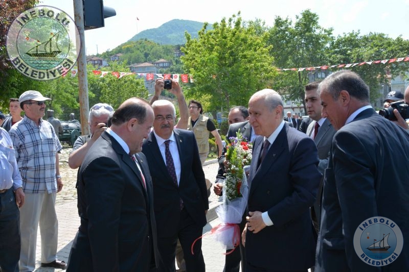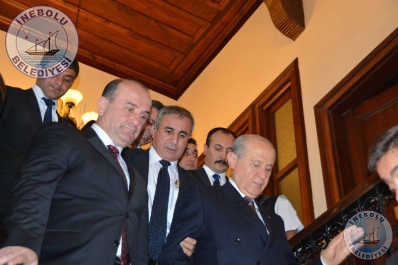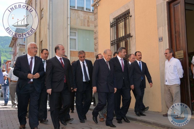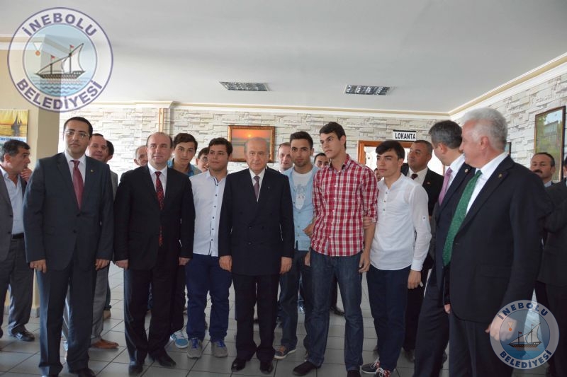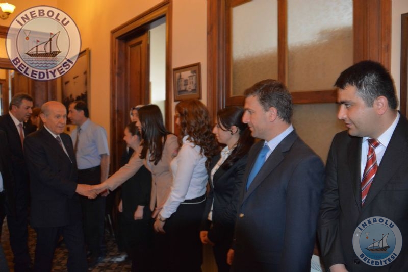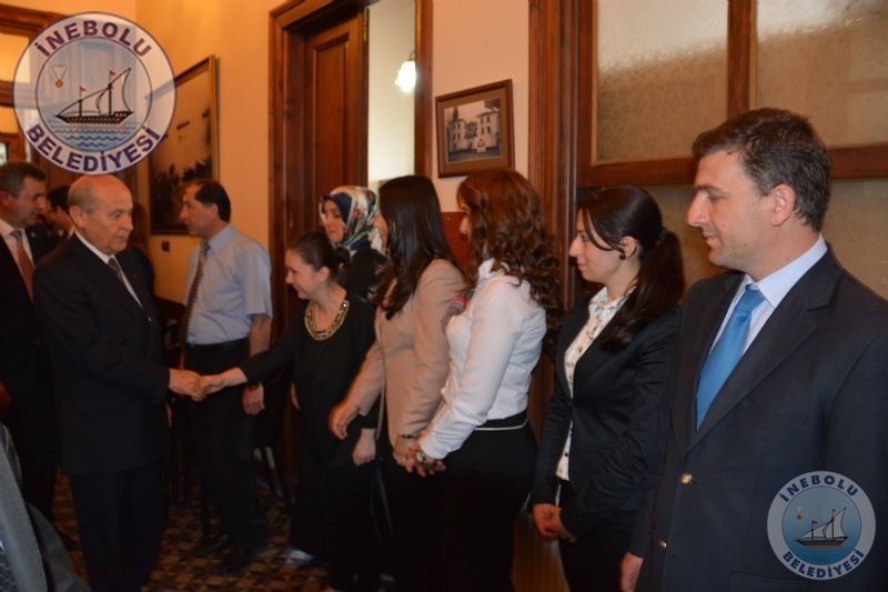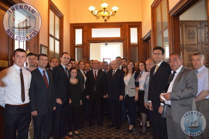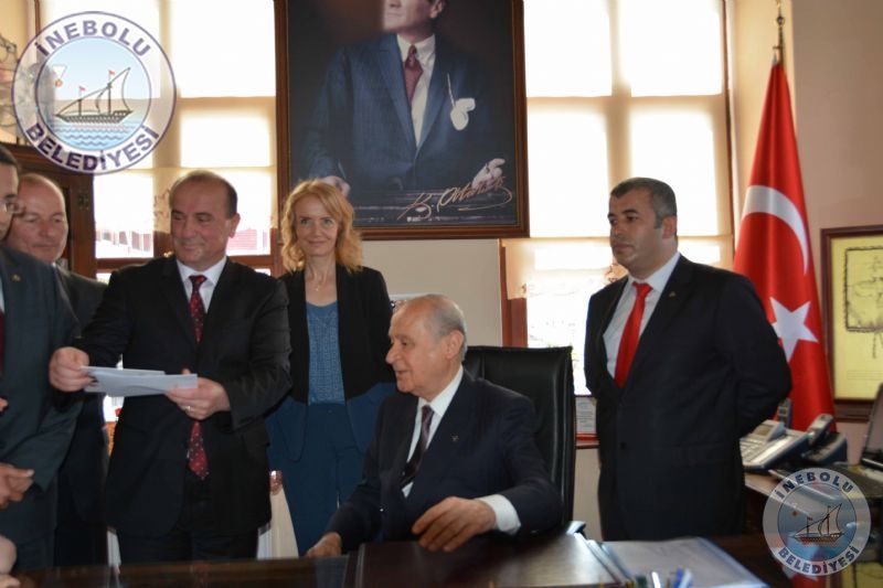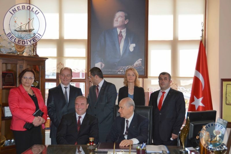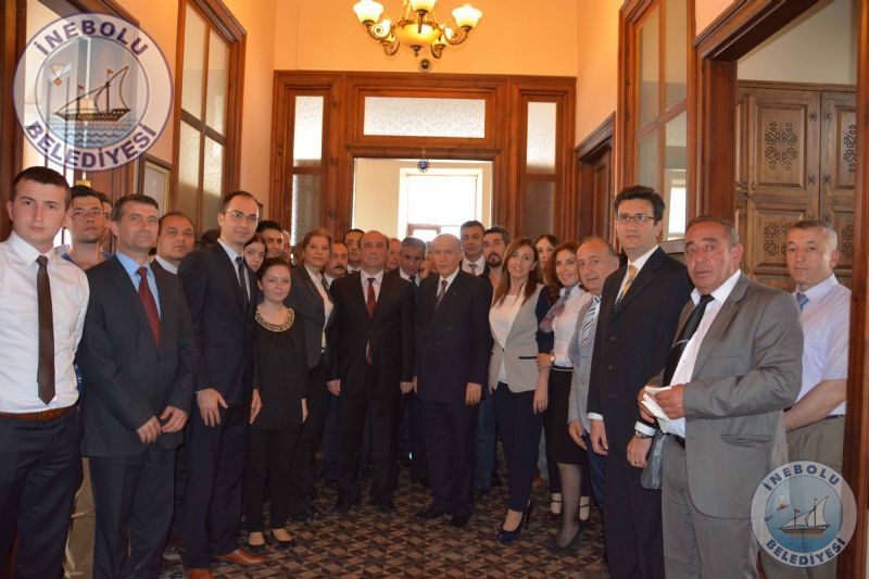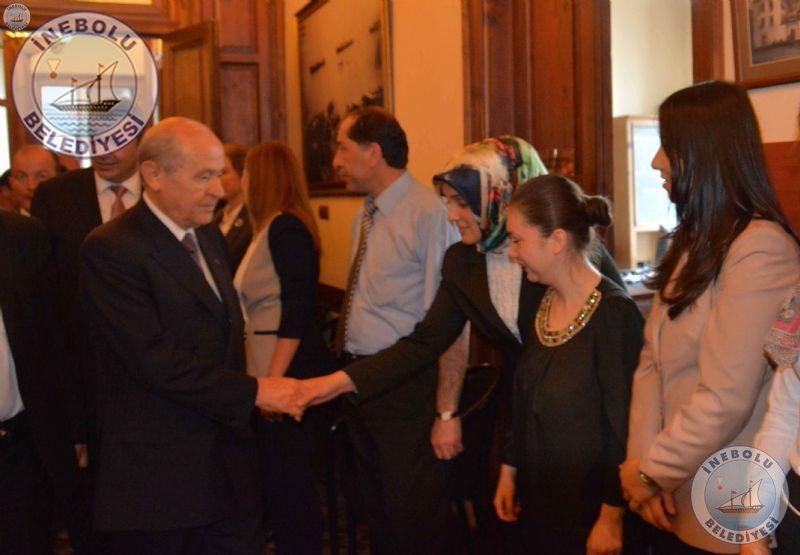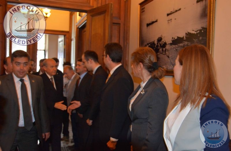 Başkanlık Makamında gerçekleştirilen ziyarette Belediye Başkanımız Engin UZUNER , BAHÇELİ’ye alimünyum folyoda İnebolu logosu işlenmiş tablo ile Şapka elinde Atatürk Rölyefi takdim etti. MHP İlçe Başkanı Mustafa ATEŞ ise BAHÇELİ’ye İstiklal Madalyası takdim edildi. Belediyemizden ayrılmadan önce BAHÇELİ, Belediye Personeli ile hatıra fotoğrafı çektirdi. Ardından Belediye binası önünde vatandaşlara hitap etti. Devlet BAHÇELİ, Belediye önündeki görüşmenin ardından Türk Ocağı binası önünde bulunan İstiklal Madalyası önünde fotoğraf çektirdi. Banka oturarak poz veren Bahçeli ve beraberindekiler yemek için İnebolu Öğretmenevi’ne geçti. Yemeğin ardından İnebolu Spor Kulübü yönetim ve oyuncuları tarafından Devlet BAHÇELİ’ye İnebolu Spor atkısı hediye edildi. Bahçeli yemek sonunda Bozkurt ilçesini ziyaret ederek, Çatalzeytin’e geçti.