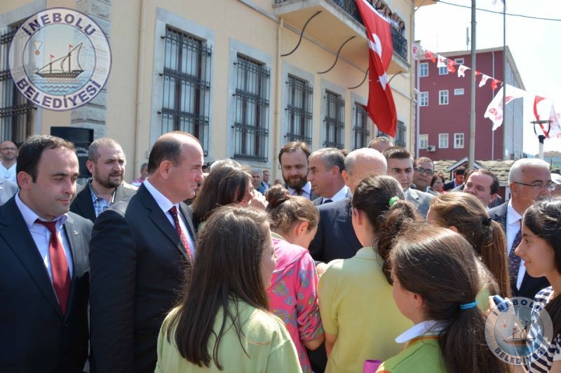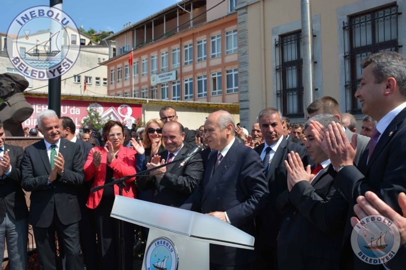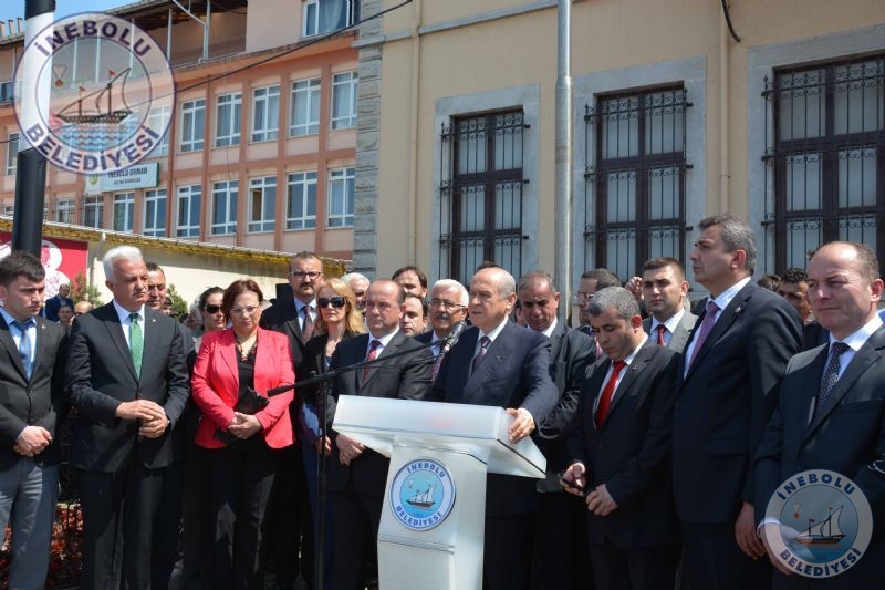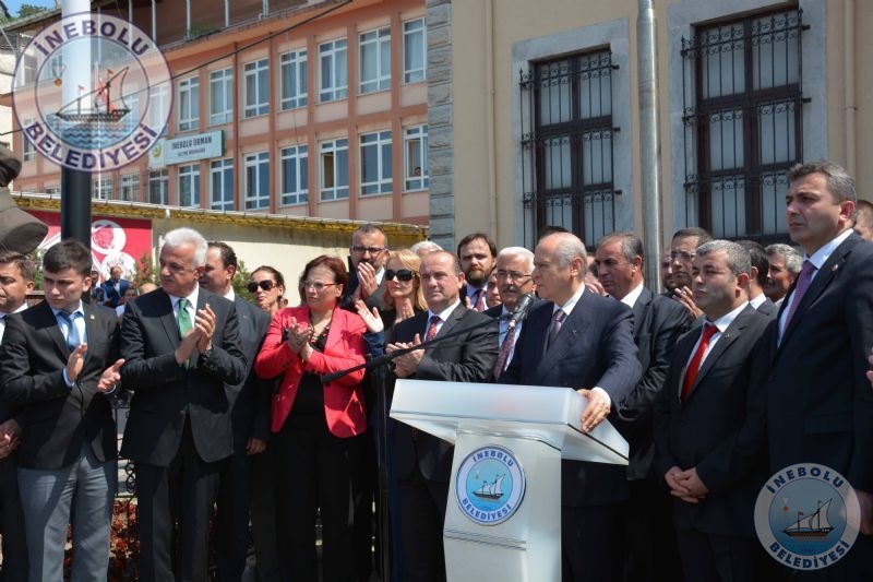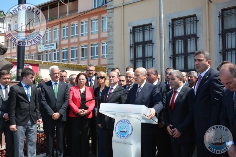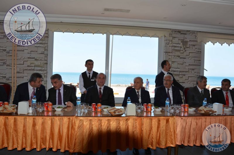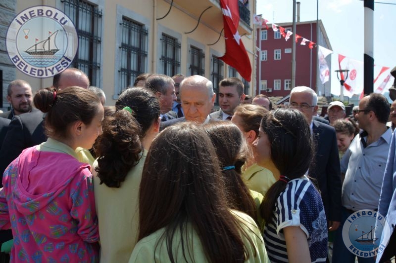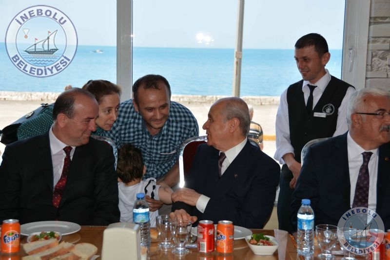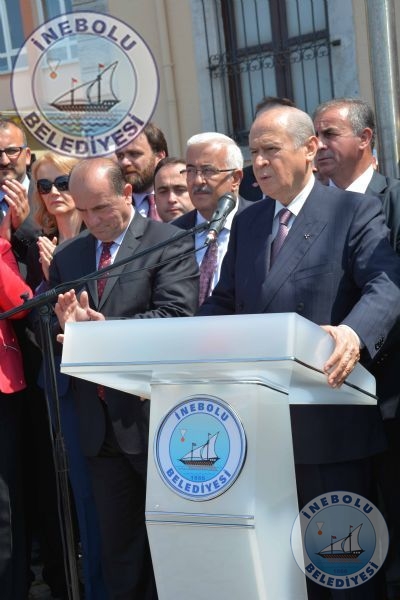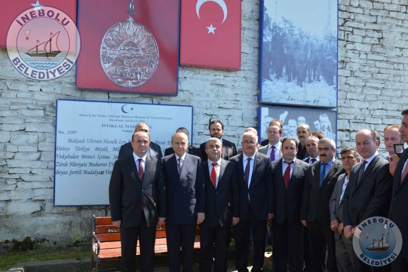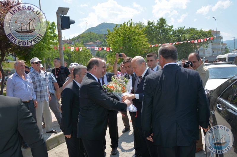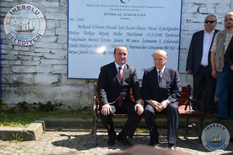 Başkanlık Makamında gerçekleştirilen ziyarette Belediye Başkanımız Engin UZUNER , BAHÇELİ’ye alimünyum folyoda İnebolu logosu işlenmiş tablo ile Şapka elinde Atatürk Rölyefi takdim etti. MHP İlçe Başkanı Mustafa ATEŞ ise BAHÇELİ’ye İstiklal Madalyası takdim edildi. Belediyemizden ayrılmadan önce BAHÇELİ, Belediye Personeli ile hatıra fotoğrafı çektirdi. Ardından Belediye binası önünde vatandaşlara hitap etti. Devlet BAHÇELİ, Belediye önündeki görüşmenin ardından Türk Ocağı binası önünde bulunan İstiklal Madalyası önünde fotoğraf çektirdi. Banka oturarak poz veren Bahçeli ve beraberindekiler yemek için İnebolu Öğretmenevi’ne geçti. Yemeğin ardından İnebolu Spor Kulübü yönetim ve oyuncuları tarafından Devlet BAHÇELİ’ye İnebolu Spor atkısı hediye edildi. Bahçeli yemek sonunda Bozkurt ilçesini ziyaret ederek, Çatalzeytin’e geçti.