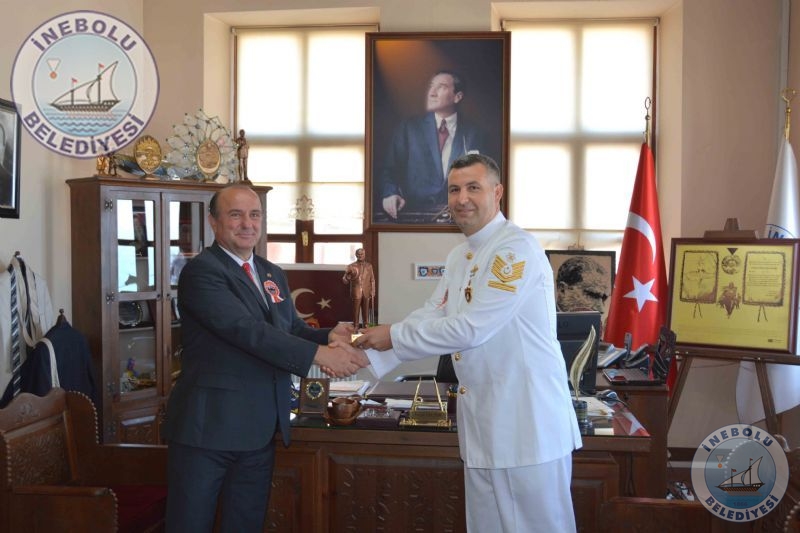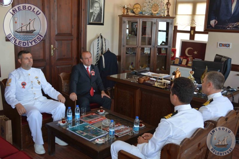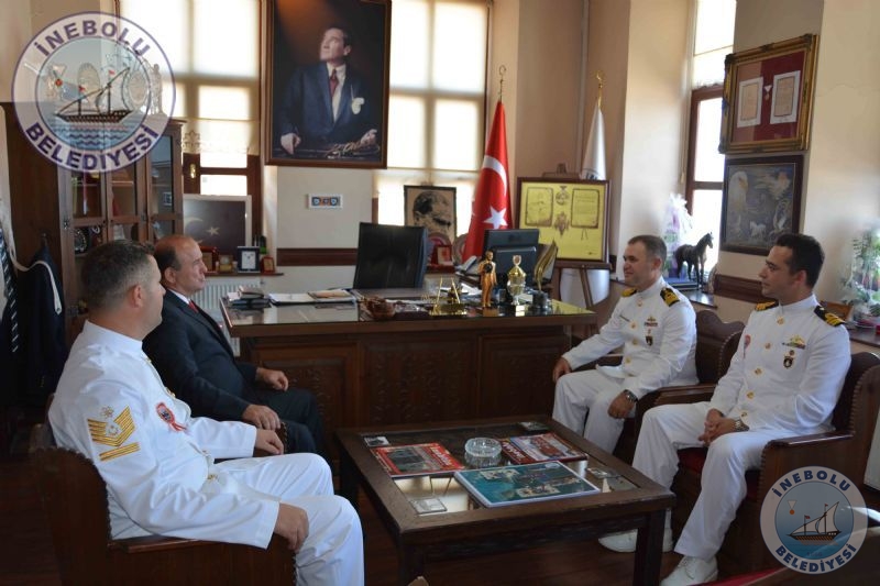 Büyük Önder Mustafa Kemal Atatürk’ün İnebolu’ya Gelişleri, Şapka ve Kıyafet İnkılabının 89.yıldönümü kutlamalarına iştirak etmek maksadıyla ilçemize gelen TCG YAVUZ Fırkateyni Komutanı Dnz. Kur. Yb. Mustafa Tufan USLU, TCG YAVUZ Fırkateyni Başçarkçısı Dz. Bnb. Veysel ORTAMEVZİ , TCG YAVUZ Fırkateyni Kıdemli Astsubayı Dz. Astsb. Eln. Kd. Bçvş. Kudret YURDAKUL Belediye Başkanımız Engin UZUNER’i makamında ziyaret ettiler.