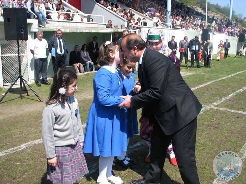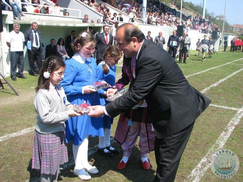 Yeni yapılan Atatürk Anıtına çelenk konulması ile başlayan törenler, daha sonra 9 Haziran Stadyumunda devam etti. Kaymakamımız, Garnizon Komutanımız ve Belediye Başkanımız öğrencilerin ve halkın bayramını kutladı. Saygı duruşu ve İstiklal Marşının okunmasının ardından öğrenciler günün anlam ve önemine dair şiirler okudu. Folklor gösterileri yapıldı. Belediye Başkanımız Sayın Engin UZUNER tarafından Dr. Salih OSMANOĞLU ve Mehmet Bülent ÖZYÜRÜK’e İlçemize yapmış oldukları yararlı hizmetleri anısına Plaket ve Şükran Belgesi takdim edildi.Okullar resmi geçit sırasında renkli görüntüler oluşturdu.