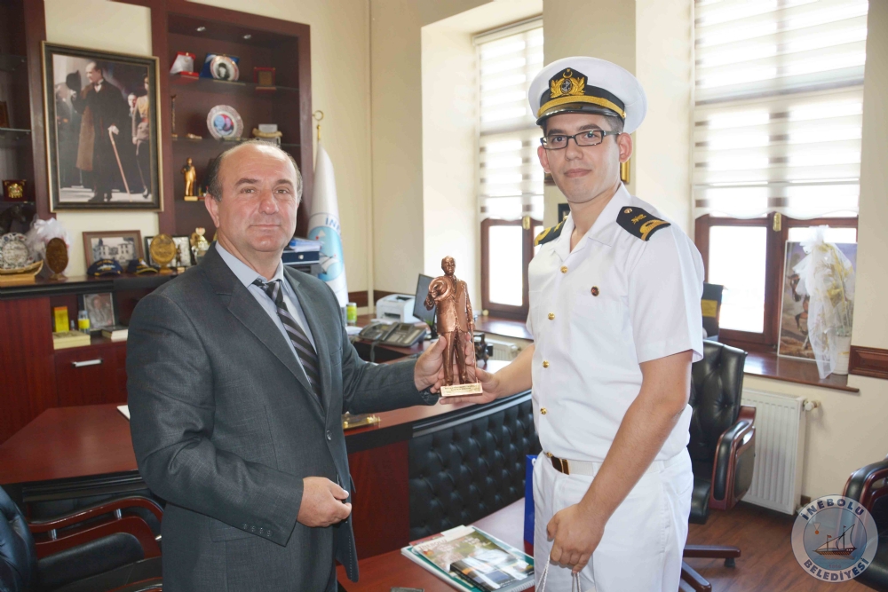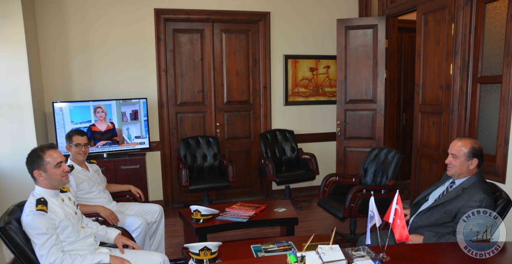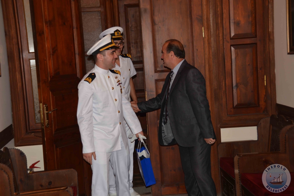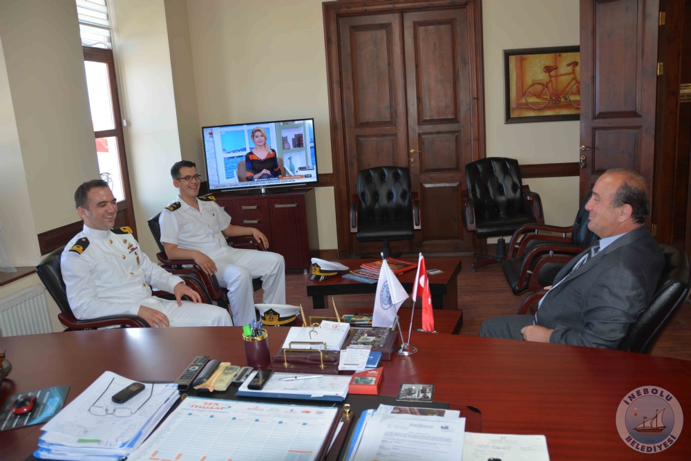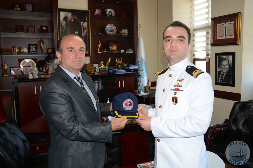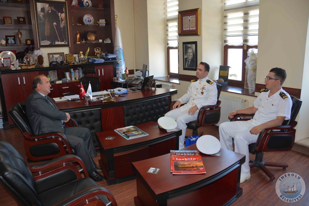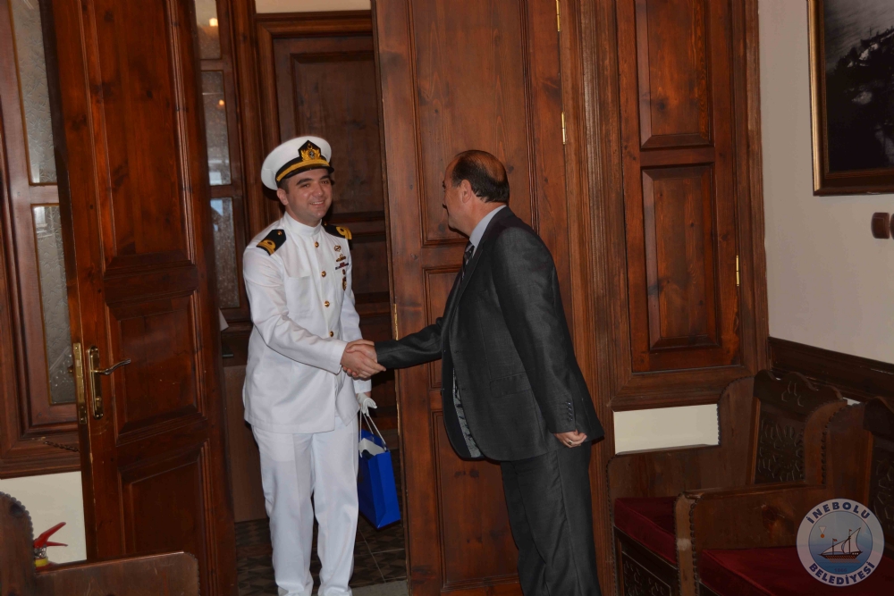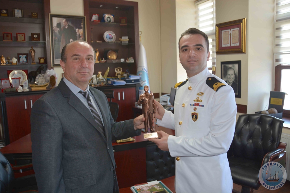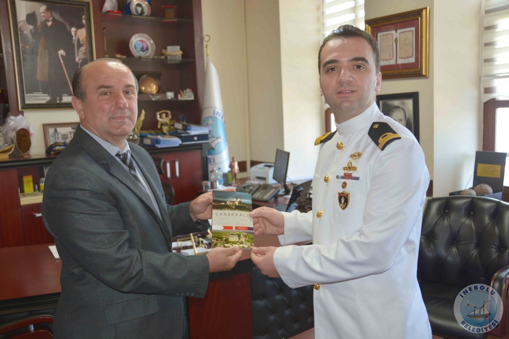 Çanakkale Deniz Savaşlarının 100. Yıl Dönümünde İnebolu Limanına gelen Müze Gemi TCG NUSRET Komutanı Deniz Yzb. Burak KANDAŞ ve Teğmen Fatih TALAY Belediye Başkanımız Engin UZUNER’i makamında ziyaret ettiler.