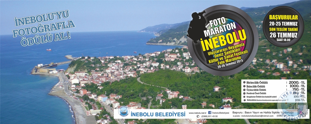 Belediyemizce 6. Uluslararası İnebolu Heyamola Deniz Şenlikleri Kültür ve Sanat Festivalimiz kapsamında, doğa, tarih, kültür ve turizm potansiyeline sahip İnebolu’muzun tarihsel, kültürel ve doğal güzelliklerini en iyi şekilde ülkemize ve dünyaya fotoğraf sanatının etkili görselliği ile tanıtmak için 20-26 Temmuz 2015 tarihleri arasında ilçemizde gerçekleştirilecek Foto Maratona başvuruları 20 Temmuz 2015 Pazartesi günü başlamıştı. Yoğun katılımla devam eden başvurularda son gün 25 Temmuz 2015 Cumartesi, fotoğraf teslim için son gün 26 Temmuz Pazar Foto Maratona katılacak yarışmacılar için son üç gün.