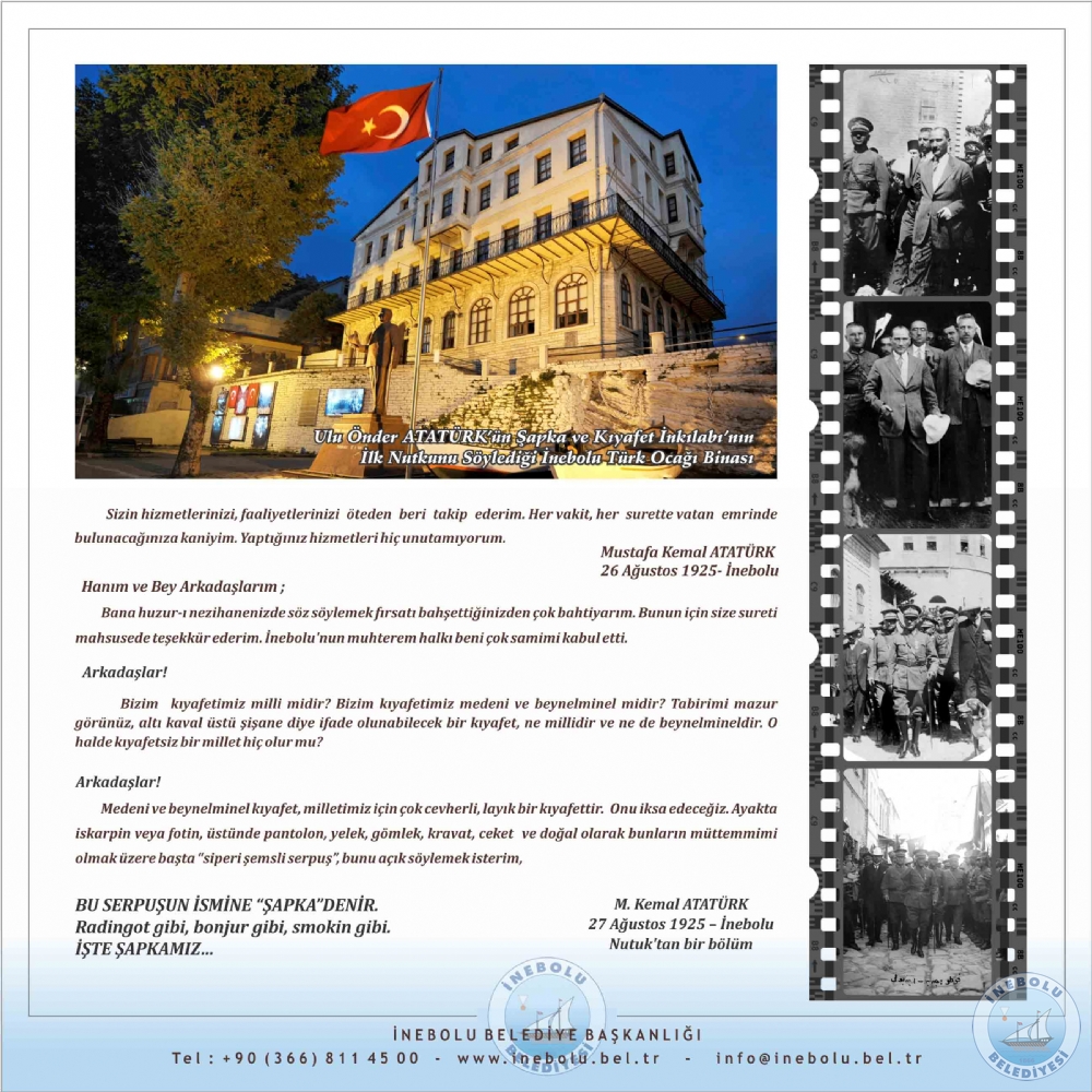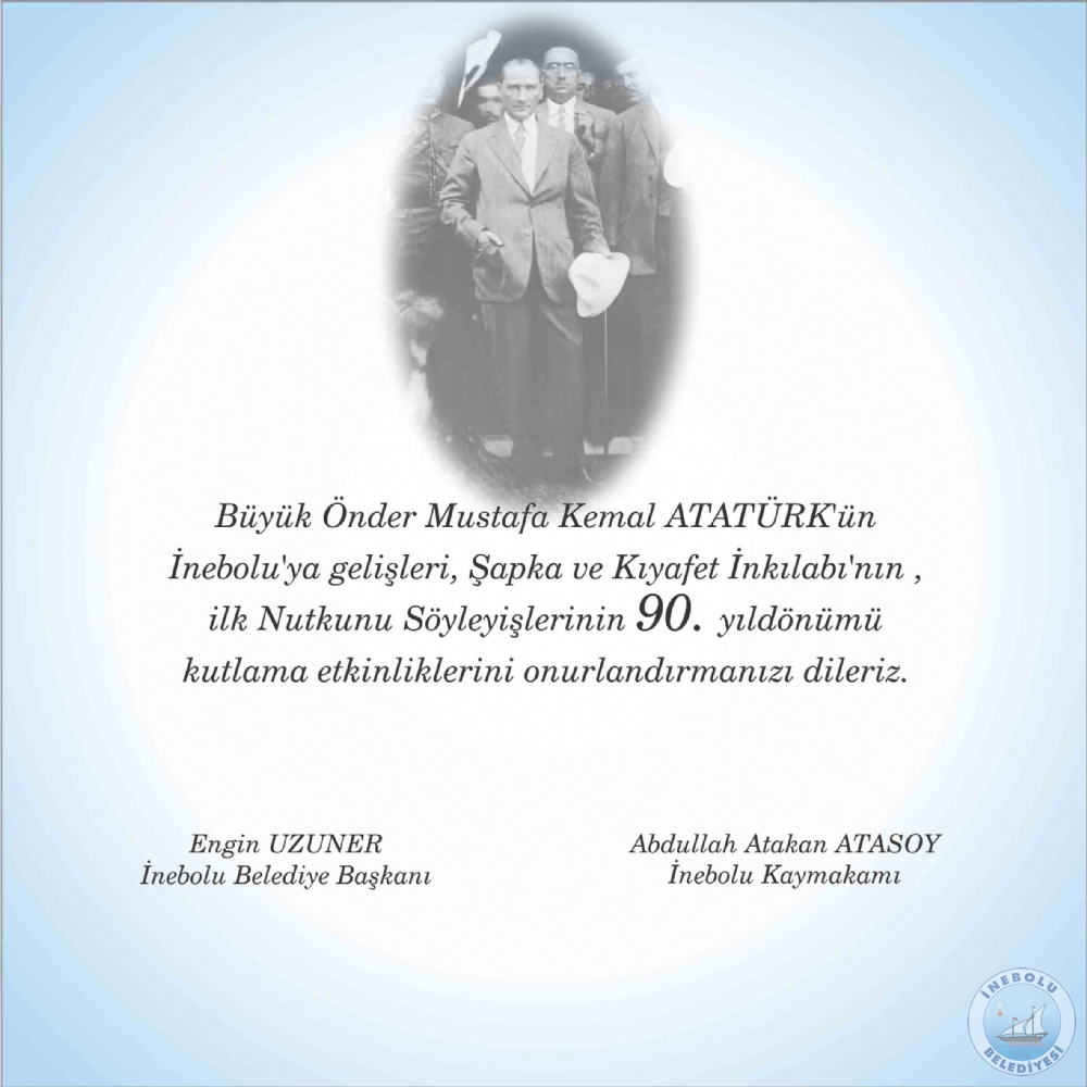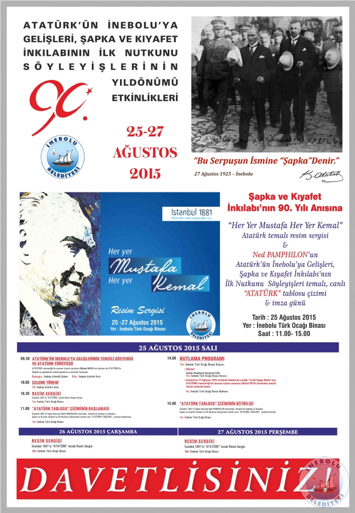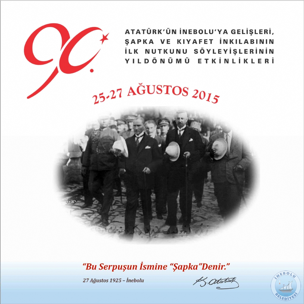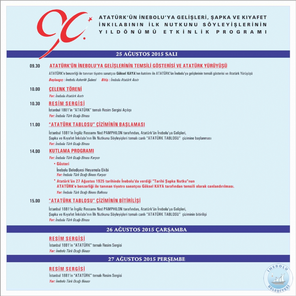 Kutlama etkinlikleri kapsamında 25 Ağustos 2015 Salı günü saat 09.30’da Atatürk’e benzerliği ile tanınan tiyatro sanatçısı Göksel KAYA’nın katılımı ile Atatürk’ün İnebolu’ya Gelişlerinin temsili gösterisi ve İnebolu Askerlik Şubesi önünden Atatürk Anıtına Atatürk Yürüyüşü gerçekleştirilecek. Müteakibinde saat 10.00’da Atatürk Anıtına çelenk sunulacaktır. Çelenk konulmasının ardından Türk Ocağı Binasında saat 10.30’ da Atatürk temalı “Her Yer Mustafa Her Yer Kemal” resim sergisi açılışı yapılacak. Açılışın ardından İstanbul 1881‘in İngiliz Ressamı Ned PAMPHILON tarafından, Atatürk’ün İnebolu’ya Gelişleri, Şapka ve Kıyafet İnkılabı’nın İlk Nutkunu Söyleyişleri temalı canlı “ATATÜRK TABLOSU” çizimine başlanacaktır. Saat 14.00’de Türk Ocağı Binası karşısında yapılacak kutlama programında İnebolu Belediyesi Heyamola ekibi gösterisini yapacak ve ardından Atatürk’ün 27 Ağustos 1925 tarihinde İnebolu’da verdiği “Tarihi Şapka Nutku” İnebolu Türk Ocağı Binası balkonunda ATATÜRK’e benzerliği ile tanınan tiyatro sanatçısı Göksel KAYA tarafından temsili olarak canlandırılacaktır.