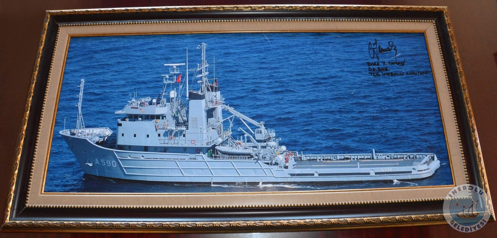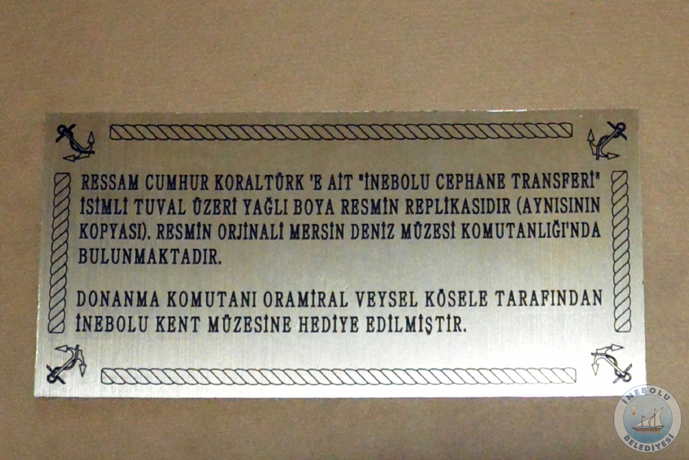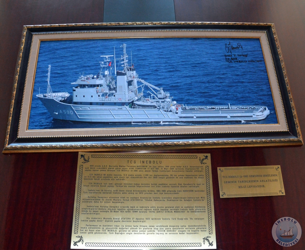 Donanma Komutanı Oramiral Veysel KÖSELE sözünde durdu. Donanma Komutanı Oramiral Veysel KÖSELE, “Kurtuluşa Giden Yolda, İnebolu Kent Müzesi ”nde sergilenmek üzere, Belediye Başkanımız Engin UZUNER’e bir adet TCG İnebolu (A-590) gemisinin çerçeveli fotoğrafı ve TCG İnebolu (A-590) gemisinde sergilenen, geminin tarihçesinin anlatıldığı bilgi levhası ile bir adet Ressam Cumhur KORALTÜRK ‘e ait “İnebolu Cephane Transferi” isimli tuval üzeri yağlı boya resmin replikasını hediye etti.