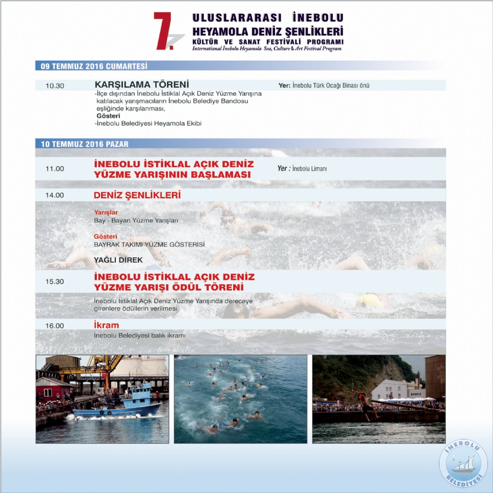 7. Uluslararası İnebolu Heyamola Deniz Şenlikleri Kültür ve Sanat Festivalimiz kapsamında Karadeniz’de ilk defa ilçemizde yapılacak, İnebolu İstiklâl Açık Deniz Yüzme Yarışına katılacak yarışmacılarımızı karşılamak üzere 09 Temmuz 2016 Cumartesi günü saat:10.00’da eski terminal alanına, saat:10.30’da karşılama törenine katılmak üzere İnebolu Türk Ocağı Binası önüne; 10 Temmuz 2016 Pazar günü saat:11.00’de İnebolu Limanı’nda yapılacak İnebolu İstiklâl Açık Deniz Yüzme Yarışına ve saat:14.00’ te Deniz Şenliklerine tüm halkımız davetlidir.