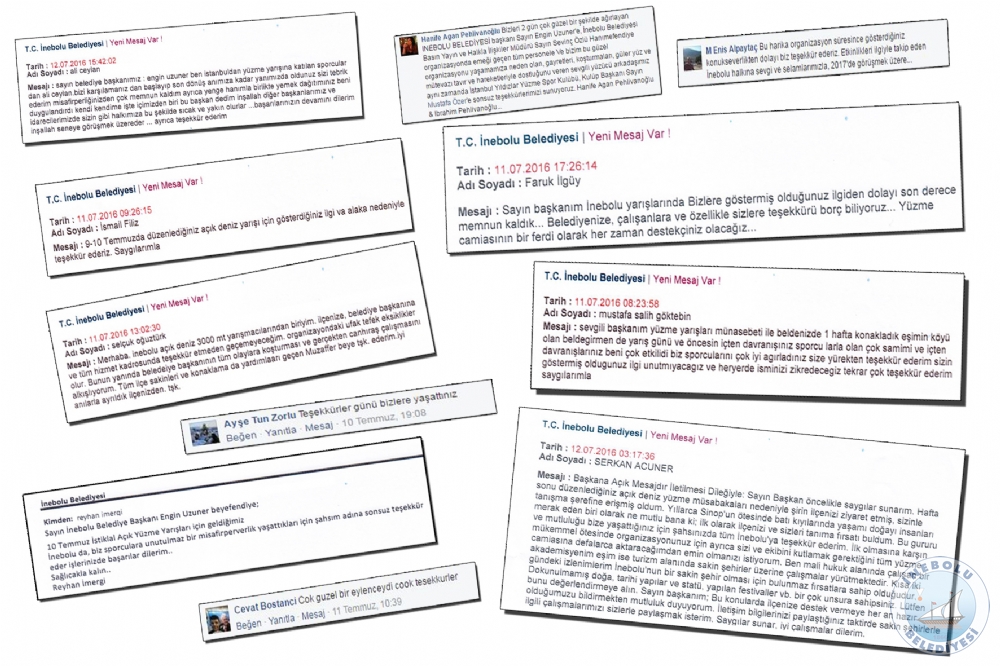 Belediyemizce gerçekleştirilen İnebolu İstiklal Açık Deniz Yüzme Yarışına teşekkür yağıyor. Gerek telefon ile gerek ise e-posta ile güzel dileklerini ileten tüm yüzücülere teşekkür ederiz.