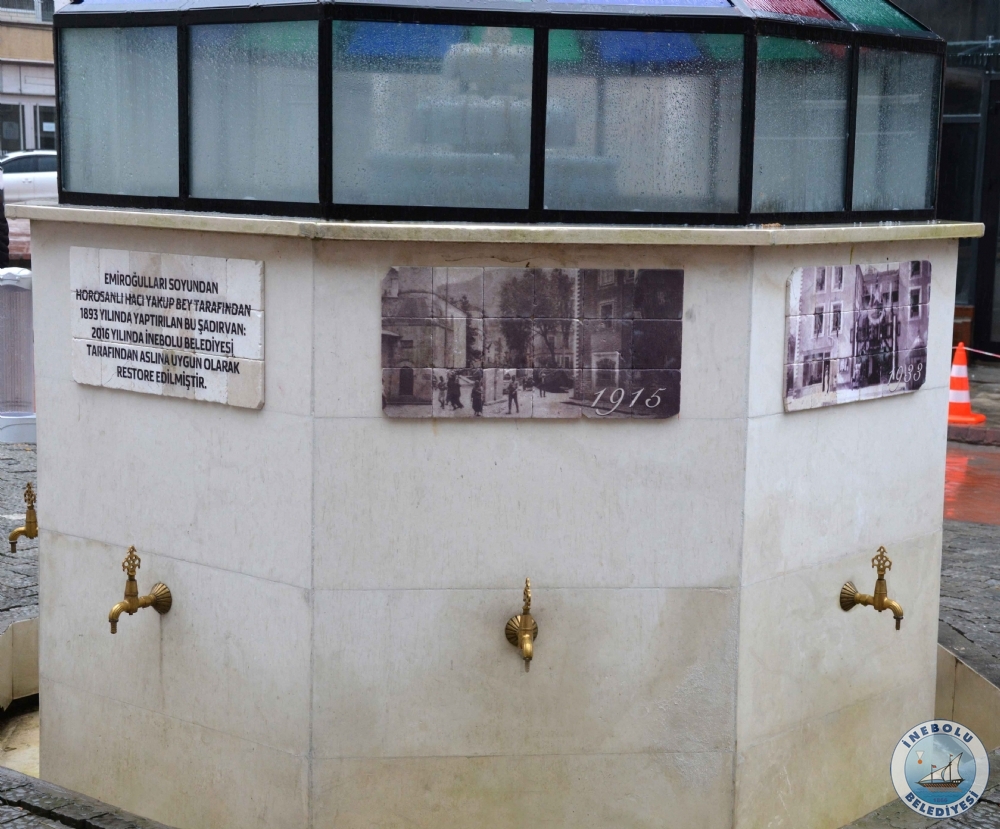 |  |  İnebolu’nun merkezinde, kentin yakın tarihinde ve sosyal yaşamında önemli bir yeri olan meydan; Sultan Hamid’in talimatı ile 1890 yıllarında, dönemin Kastamonu Valisi Abdurrahman Paşa tarafından,  medrese olarak yaptırılan eski Belediye Binası,  günümüz “Kurtuluşa Giden Yolda, İnebolu Kent Müzesi”; 19. yüzyıl yapısı Yahya Paşa Camisi ve iki katlı ticaret mekânları ile çevrelenmiştir.  Geçmişte bayram kutlamaları ve toplantıların yapıldığı meydanda o yıllarda Emiroğulları soyundan Horasanlı Hacı Yakup Bey tarafından 1893 yılında yaptırılan şadırvan da yer almakta idi.