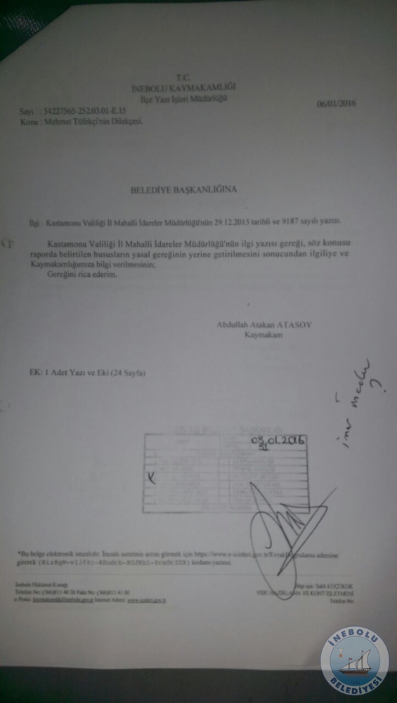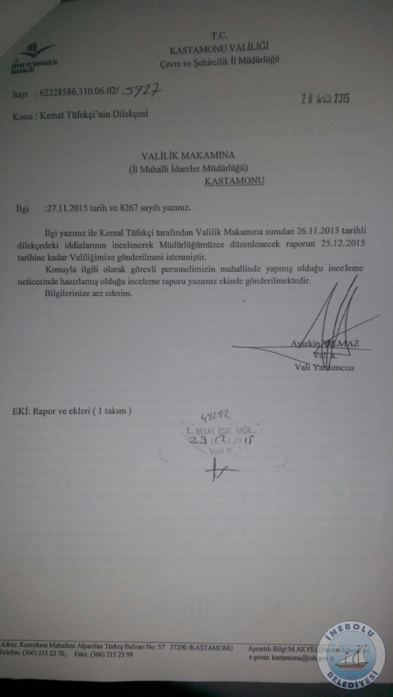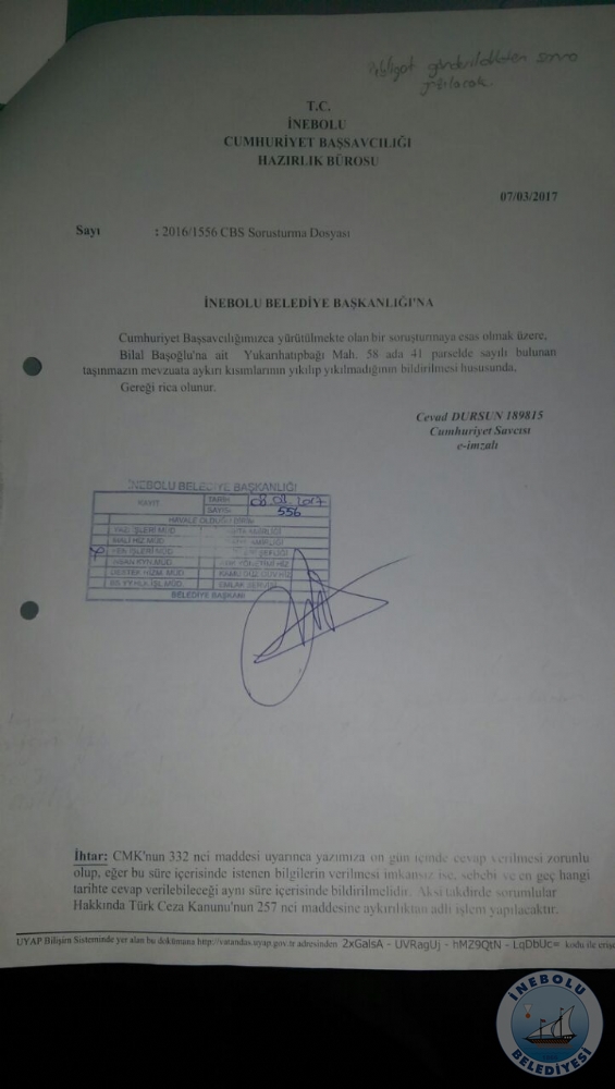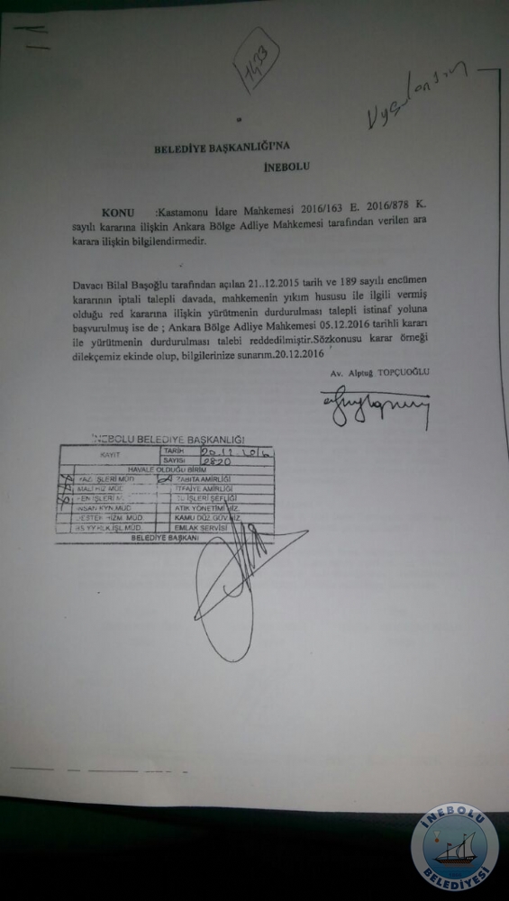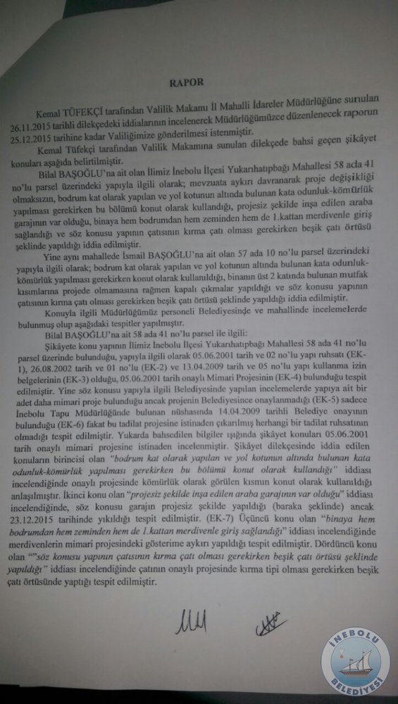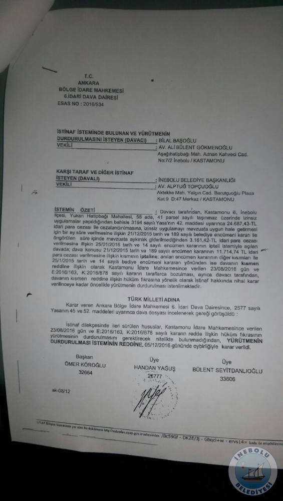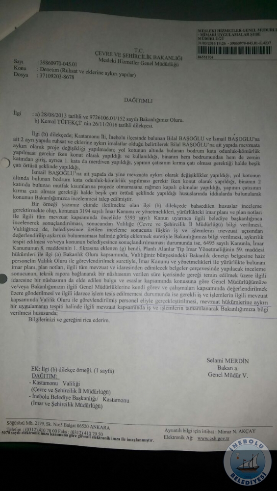 Sayın Murat DEMİR, Bilal BAŞOĞLU meselesinde ben ne yaptıysam kanun ve nizamlar çerçevesinde hareket ettim. Vatandaş yapısını kanuna uygun olarak yapmadıysa komşusu sürekli şikayet dilekçeleri veriyorsa bunda bizim ne kabahatimiz var? Bilal Başoğlu meselesi ile ilgili olarak Kastamonu Çevre Şehircilik İl Müdürlüğünden gelen yetkililer şahsın yaptığı yapıyla ilgili incelemelerde bulundular. Sonucunda da şahsın ruhsatsız olarak nizama uygun olmadan yapmış olduğu kısımların yıktırılması talebinde bulundular. Uygulanmadığı taktirde de hakkımızda görevi kötüye kullanmaktan suç duyurusunda bulunulacağını belirttiler. Şimdi sorarım size böyle bir durumda siz ne yapardınız? Hoş ben ilgili kurumun verdiği kararı hemen uygulamadım. Bunca zaman vatandaş gelirde bir uzlaşma yoluna gidilir diye son ana kadar bekledim. Gelmediler. Araya aracılar koydum, düzelsin bu sorunlar diye. Belediye Encümeni olarak noksanlığın giderilmesi, sıkıntının çözülmesi için yazılar yazdım, öneriler sundum. Girişimlerim hep sonuçsuz kaldı. Bu şahıslar hep aile boyu uzlaşma yolunu seçmeyip bizler Ak Partiliyiz, iktidarız, yaparız ederiz Eda’larıyla tehditlere devam ettiler. Dava açtılar, fakat açtıkları tüm davaları da kaybettiler. Bu konu ile ilgili olarak ilk aşamasından son aşamasına kadar olan tüm belgeleri de sizler bilgilensin diye açıklamamın ekinde sunuyorum.