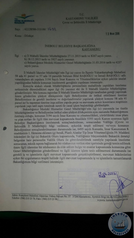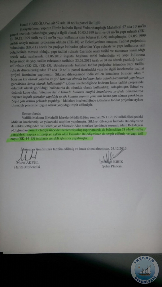 Sayın Murat DEMİR, şu bilinmelidir ki bu olay bina yıkımı değildir. İzin alınmadan ruhsatsız olarak yapılmış bölümlerin yıkılması uygun hale getirilmesi işidir. Fakat anlayıp dinlemeden art niyetli insanlarımız bu olayı İnebolu Belediyesi vatandaşın evini yıkıyor diye halka servis ederek insanlarımızı birbirine düşürmektedirler. Yaptığım her işin sonuna kadar arkasındayım. Usulsüz hiç bir uygulamada bulunmadım. Beyanatınız da Bakanlık nezdinde görüşmeleri başlatacağınızı söylüyorsunuz. Başlatacağınız zaman o makamlara beraber gidelim de, o insanlar kimin haklı kimin haksız olduklarını görsünler. Yukarıda da belirttiğim üzere yapılan tüm işler kanun ve nizamlar çerçevesinde yapılmıştır. Bu olay sürecinde Savcılık makamı olayla ilgili olarak sürekli ne yaptığımızı, şikayet eden şahıs da neden hiç bir şey yapmadığımızı sormaktadırlar. Ne yapabilirim sizler karar verin. Bizler muhalefet ve MHP’li Belediye olduğumuzdan sizin nezdinizde sürekli hedef haline geldik. Bu konu aslında benden önceki Ak Partili Belediye Başkanının zamanından beri gelmektedir. Ama bizler muhalefet olduğumuzdan amaç bizi sıkıntıya sokmaktır. Benim açımdan hiç bir sorun değil. Evvel Allah her işten alnımızın akıyla bir kez daha aklanarak çıkıyoruz. Sizler hakkımızda anlayıp dinlemeden sürekli atıp tuttunuz. En son ilçeye yapılacak olan hastane ile ilgili olarak ta attınız, tuttunuz. Çevre Şehircilik İl Müdürlüğünden gönderttiğiniz yetkililer hastaneye bile ruhsat düzenleyemezsin dediler. Vermeyince de beni suçlu ilan ettiniz, beni yaptırtmıyor dediniz. Halbuki ilgili Müdürlüğü arasaydınız ilgili şahıslarla görüşseydiniz haklının kim olduğunu bir kez daha anlayacaktınız. Sizler kanun yapıcısınız. Bu konularla ilgili özelliklede kaçak yapılarla ilgili düzenlemeler yapın ki bizlerde yerel yönetimler olarak sıkıntılar çekmeyelim.