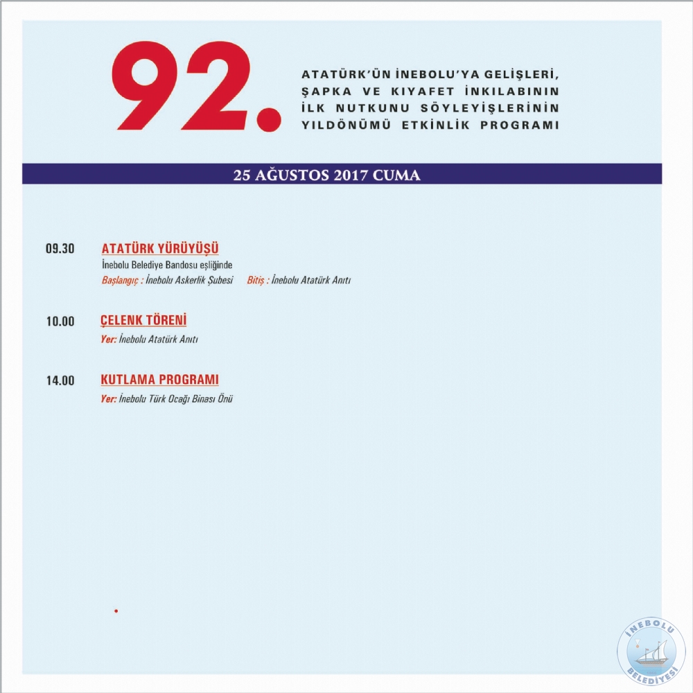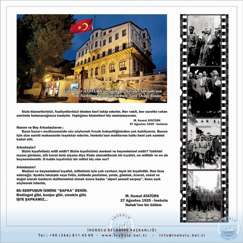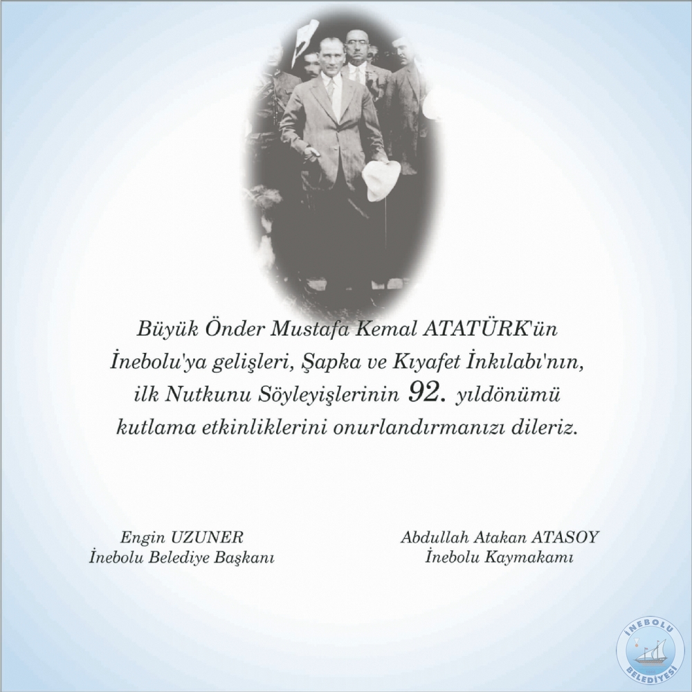 Bu yıl 92. defa kutlayacağımız, Atatürk’ün İnebolu’ya Gelişleri ve “Bu Serpuşun İsmi Şapkadır” diyerek Şapka ve Kıyafet inkılabının ilk nutkunu söyleyişlerinin, İlçemizde kutlama etkinliklerinin hazırlıkları günün anlam ve önemine uygun kutlanabilmesi için Belediyemizce süratle devam ediyor.