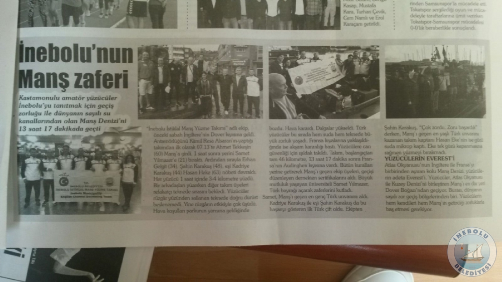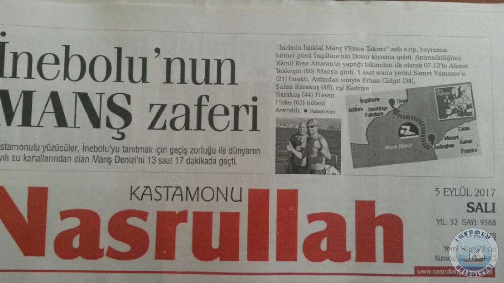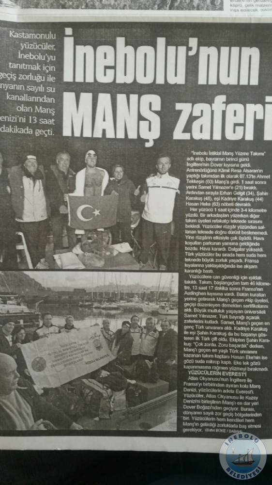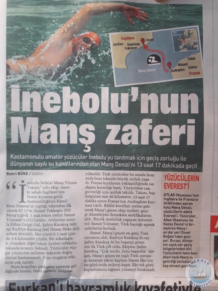 Belediyemiz sponsorluğunda İngiltere’nin Dover kıyısından Fransa’nın Wİssant kentine sınırsız kulaçlar atarak başarı ile Manş Denizi geçişini gerçekleştiren İnebolu Belediyesi İstiklal Manş Yüzme Takımı ve Manş geçişi esnasında bizzat yanlarında bulunarak desteklerini esirgemeyen Belediye Başkanımız Engin UZUNER, “İnebolu’nun Manş zaferi” ile ulusal basında yer aldı.