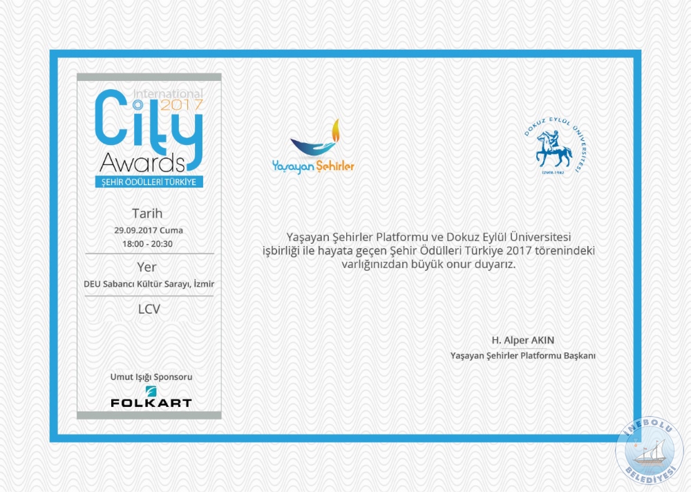 Yaşayan Şehirler Platformu ve Dokuz Eylül Üniversitesi işbirliğiyle, T.C. Kalkınma Bakanlığı  ve T.C. Kültür ve Turizm Bakanlığı  destekleri ile  gerçekleştirilecek  olan “Şehir Ödülleri Türkiye ” ödül  törenine;  İnebolu  Belediyesi  davet  edilmiştir.