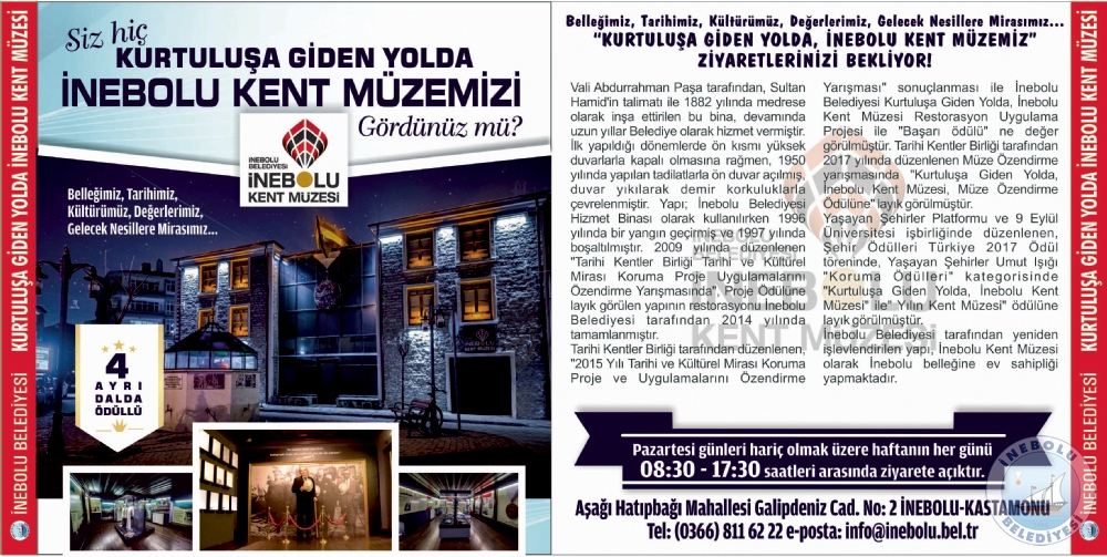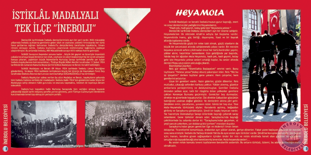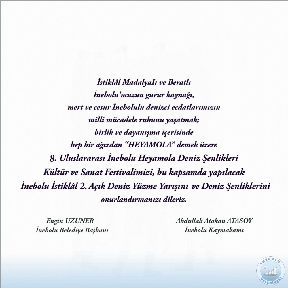 İstiklâl Madalyalı ve Beratlı İnebolu’muzun gurur kaynağı, mert ve cesur İnebolulu denizci ecdatlarımızın milli mücadele ruhunu yaşatmak; birlik ve dayanışma içerisinde hep bir ağızdan ‘‘HEYAMOLA’’ demek üzere 8. Uluslararası İnebolu Heyamola Deniz Şenlikleri Kültür ve Sanat Festivalimize, bu kapsamda yapılacak ‘‘İnebolu İstiklâl 2. Açık Deniz Yüzme Yarışı’’ ve Deniz Şenliklerine tüm halkımızın katılımını bekliyoruz.