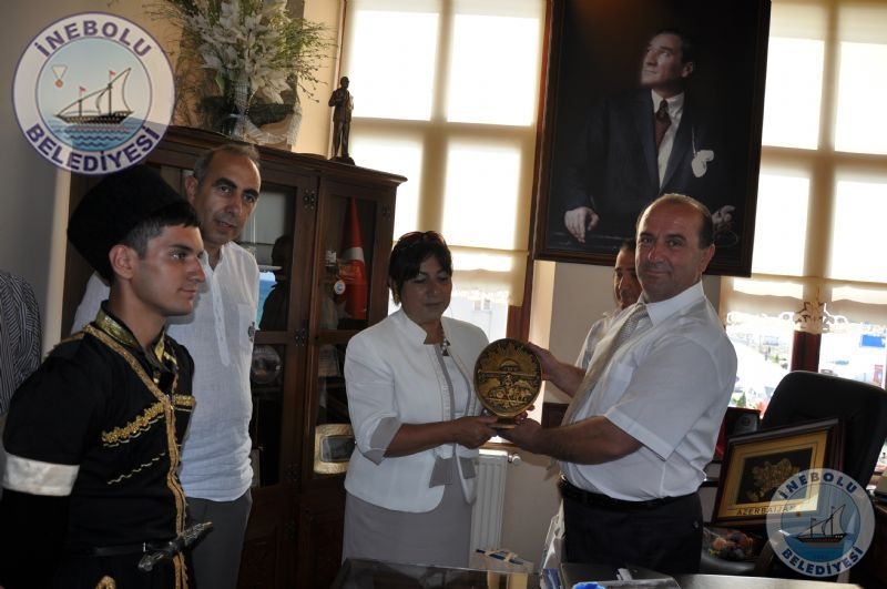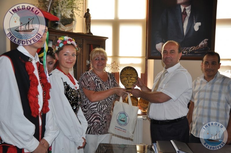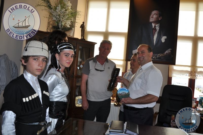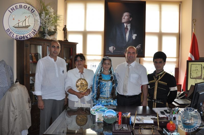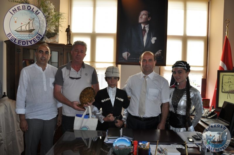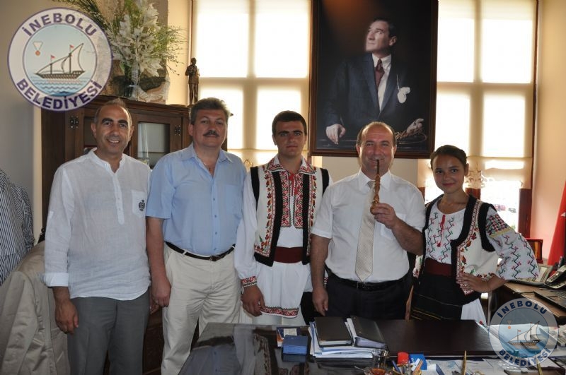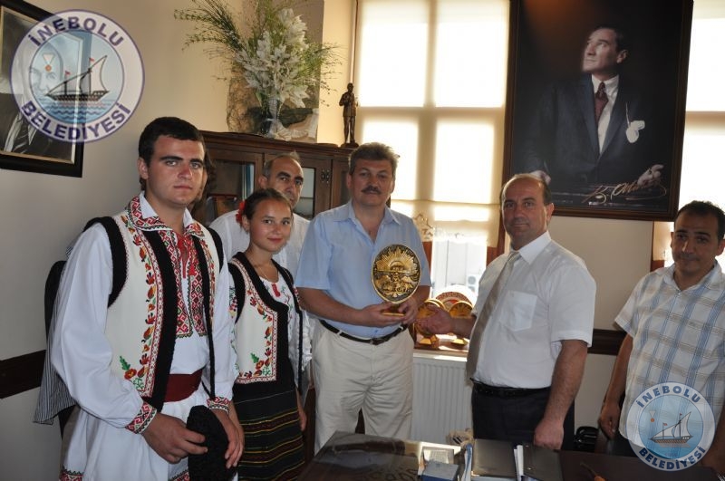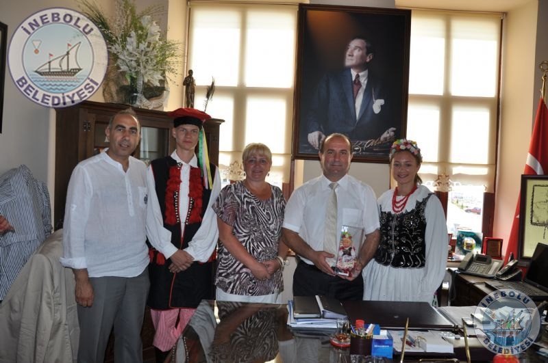 iNEBOLU 2. Uluslararası Heyamola Deniz Şenlikleri Kültür ve Sanat Festivalimize katılan Moldova, Gürcistan,Polonya,Azarbeycan,Samsun Atakum Belediyesi Halk Oyunları ekibi, Türkiye fomget halk dansları toplulukları Belediyemize gelerek Başkanımızı makamında ziyeret ettiler. Başkanımıza kendi ülkelerine ait çeşitli hediyeler sundular. Belediye Başkanımız İlçemize gelişlerinden duydukları memnuniyeti dile getirerek, kendilerine İstiklal Madalyası Rolyefi ve yöresel dokuma bezinden içinde çeşitli hediyelerin bulunduğu çanta hediye etti.