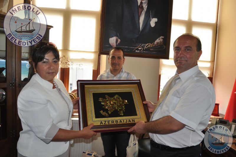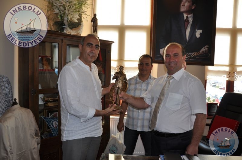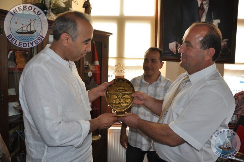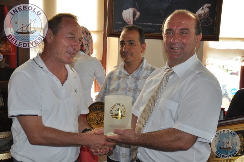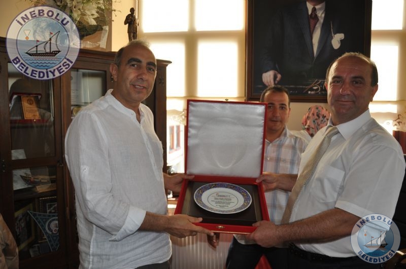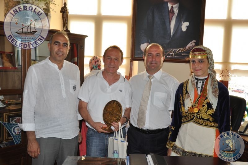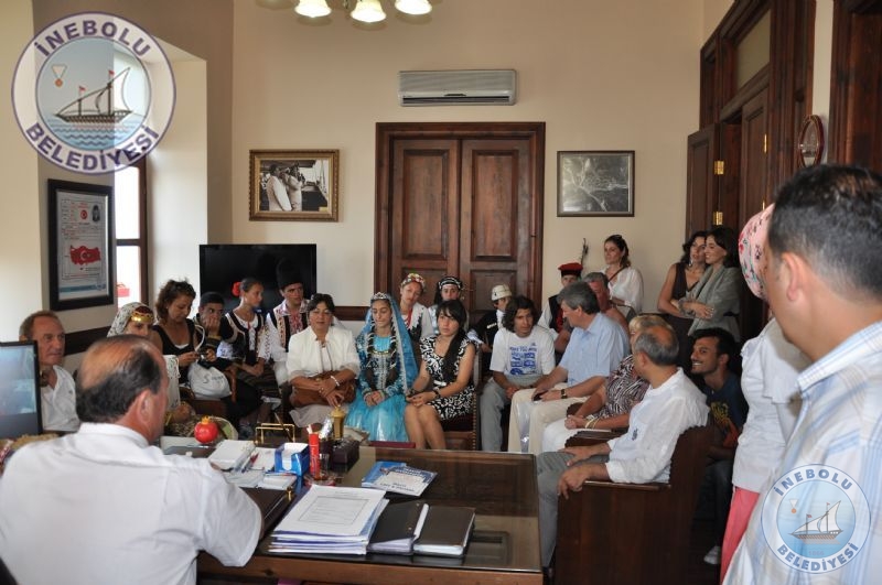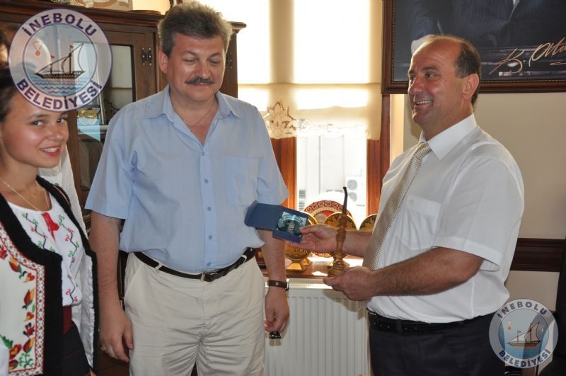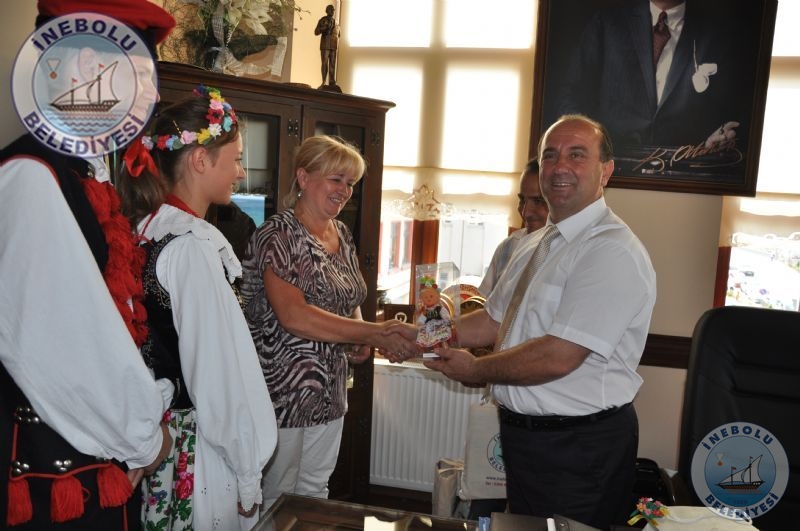 iNEBOLU 2. Uluslararası Heyamola Deniz Şenlikleri Kültür ve Sanat Festivalimize katılan Moldova, Gürcistan,Polonya,Azarbeycan,Samsun Atakum Belediyesi Halk Oyunları ekibi, Türkiye fomget halk dansları toplulukları Belediyemize gelerek Başkanımızı makamında ziyeret ettiler. Başkanımıza kendi ülkelerine ait çeşitli hediyeler sundular. Belediye Başkanımız İlçemize gelişlerinden duydukları memnuniyeti dile getirerek, kendilerine İstiklal Madalyası Rolyefi ve yöresel dokuma bezinden içinde çeşitli hediyelerin bulunduğu çanta hediye etti.