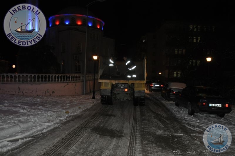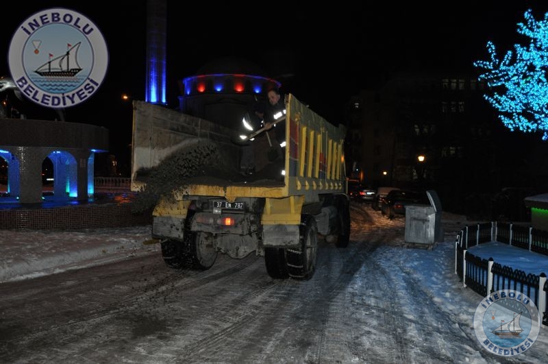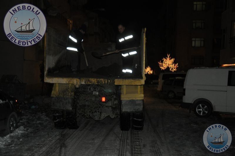 Meteorolojiden gelen kar yağışı uyarısına; İnebolu ’da herhangi bir olumsuzluk yaşanmaması için  Belediye  ekiplerimiz çarşı içi sokaklarda ve mahallerde, buz tutan yollarda kumlama çalışmalarını aralıksız devam ettiriyor.