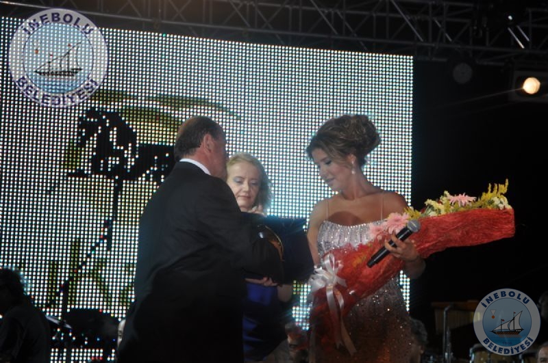 İnebolu Belediye Başkanı Engin Uzuner, katılımdan dolayı Gülben Ergen'e İstiklal Madalyası rölyefi takdim ederken, eşi Nilüfer Uzuner ise çiçek verdi.
