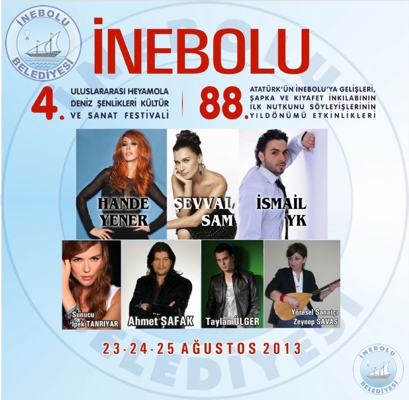 23-24-25 Ağustos 2013 tarihlerinde  gerçekleştirilecek  olan,  4.Uluslararası İnebolu Heyamola Deniz Şenlikleri Kültür ve Sanat Festivali ve Atatürk’ün İnebolu’ya Gelişleri, “Bu Serpuşun İsmi Şapkadır” diyerek Şapka  ve  Kıyafet İnkılabı’nın  ilk  nutkunu  söyleyişlerinin 88. Yıldönümü  etkinliğinde,  Konser  sanatçısında   değişiklik  oldu.