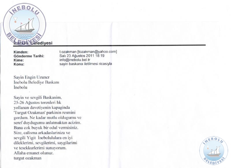 “Sayın ve Sevgili Başkanım, 25-26 Ağustos törenleri için yollanan davetiyenin kapağında”Turgut ÖZAKMAN” Parkının resmini gördüm. Ne kadar mutlu olduğumu ve şeref duyduğumu anlatmaktan acizim. Bana çok büyük bir ödül vermişsiniz. Size , çalışma arkadaşlarınıza ve sevgili Yiğit İnebolulara en iyi dileklerimi, sevgilerimi, saygılarımı ve teşekkürlerimi sunuyorum. Allaha emanet olunuz.”